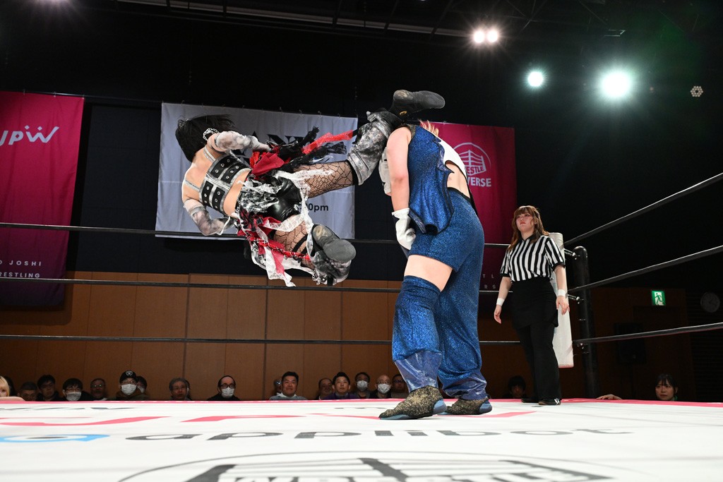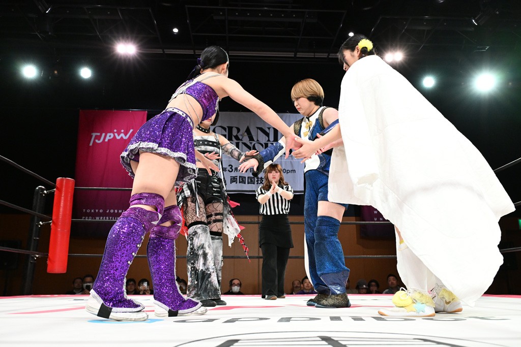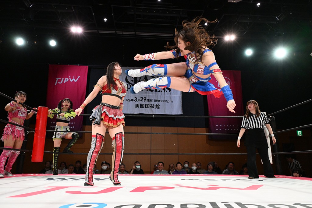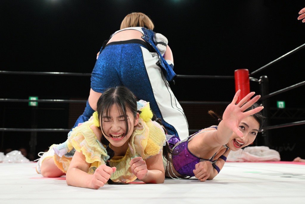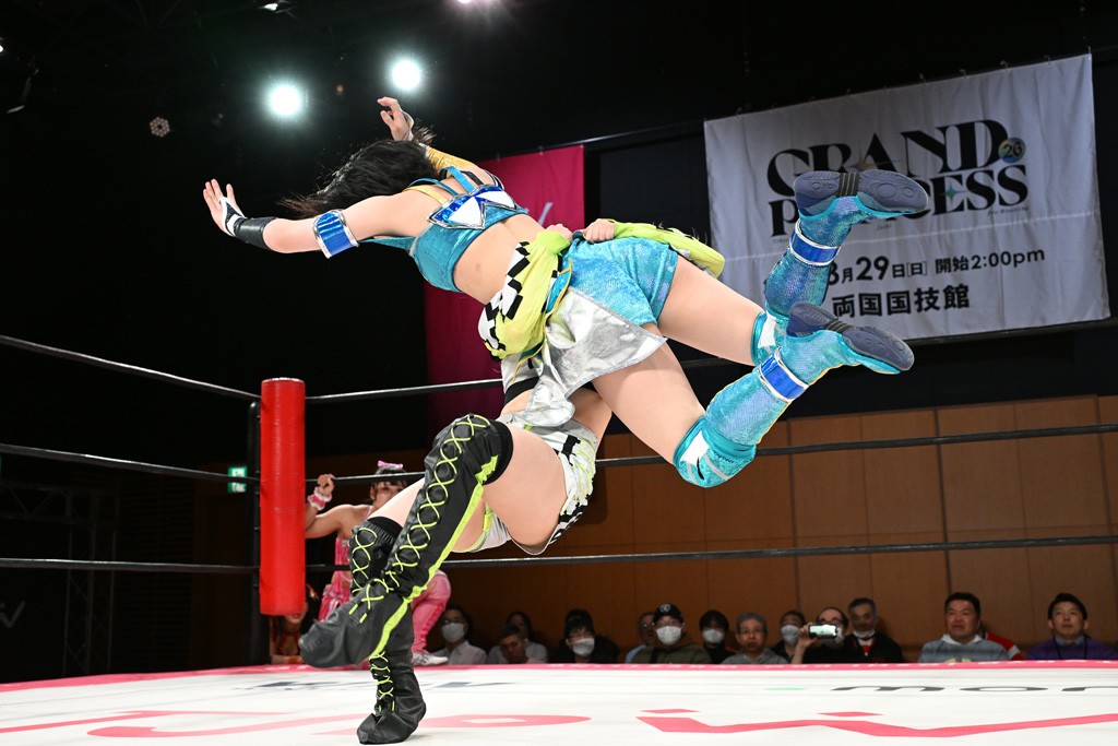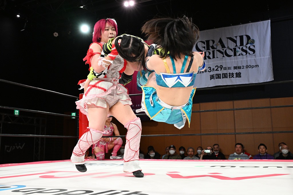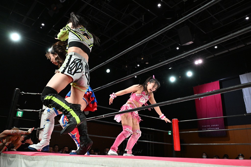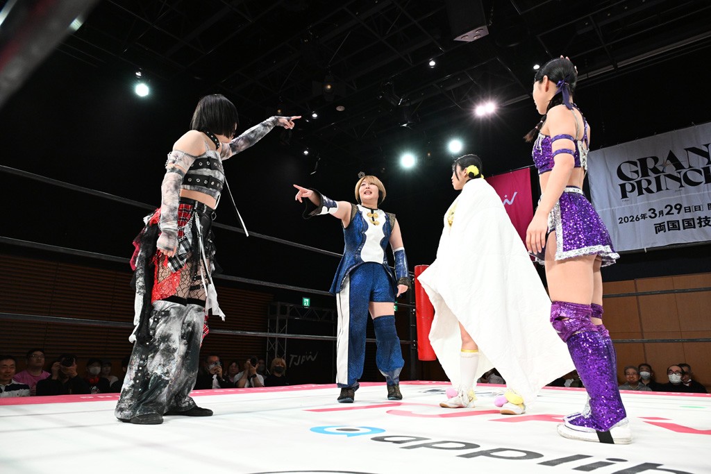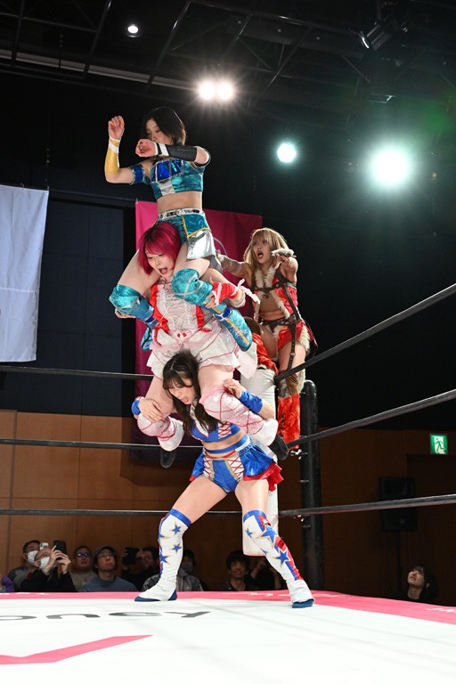 汐珠と志音がタッグ対決で両国国技館の前哨戦。その2人で試合開始。汐珠がバックを取ってグラウンドへ。立ち上がってバックエルボー。志音のヘッドシザースを抜けて両軍スイッチ。力比べからグラウンドを経て千花が自コーナーへ。志音を捕まえて志乃が観光案内し、串刺しバックエルボー。かわった汐珠は腕をきめると志音はエスケープ。ハンマースルーを拒否した志音がバックエルボー。5分経過。千花にかわって串刺しドロップキック。ランニング・エルボーはカウント2。稲荷鳥居は汐珠が脱してコアラクラッチ。回避されると丸め込んだが、カウント2。コーナー反転式ミサイルキックを放って志乃へ。ネックブリーカードロップは耐えた千花がエルボーを浴びせて志音にスイッチ。ロープに走ってドロップキックはカウント2。さらにスリーパーをエルボーで脱した志乃を丸め込む。カウント2。ランニング・バックエルボーからスリーパーで捕獲。しかし、志乃が脱出して胴絞めスリーパー。汐珠がドロップキックでカットに入った千花を排除。千花のベリー・トゥ・ベリーに志音がエルボーで抵抗するも、志乃がドロップキックからのベリー・トゥ・ベリーで3カウント奪取。