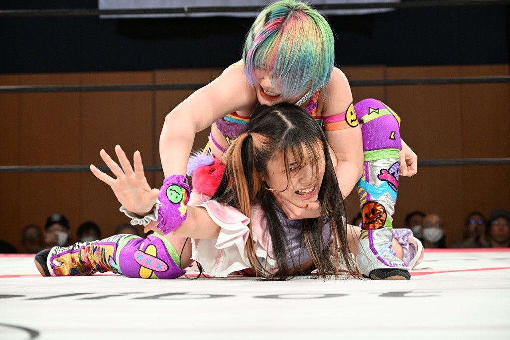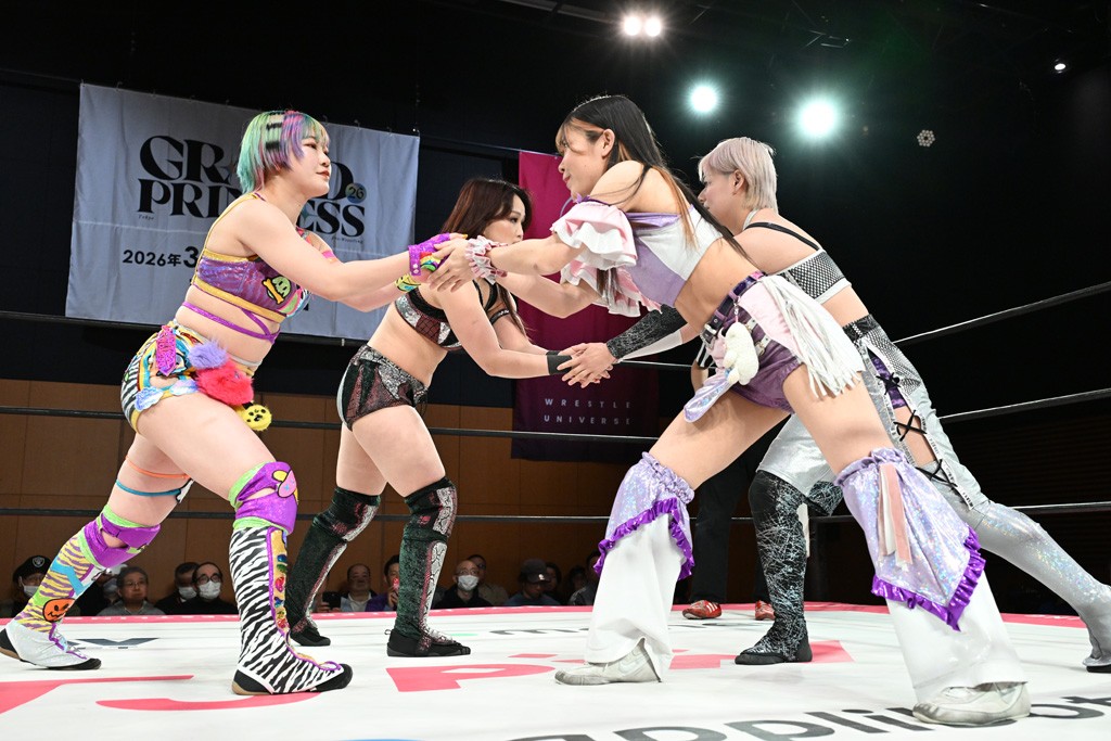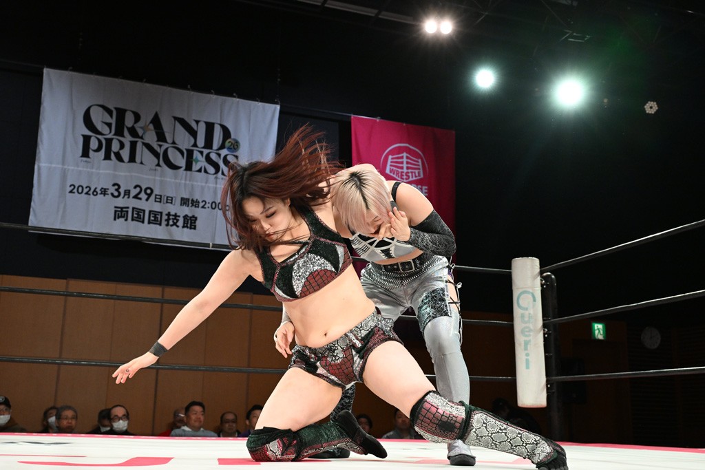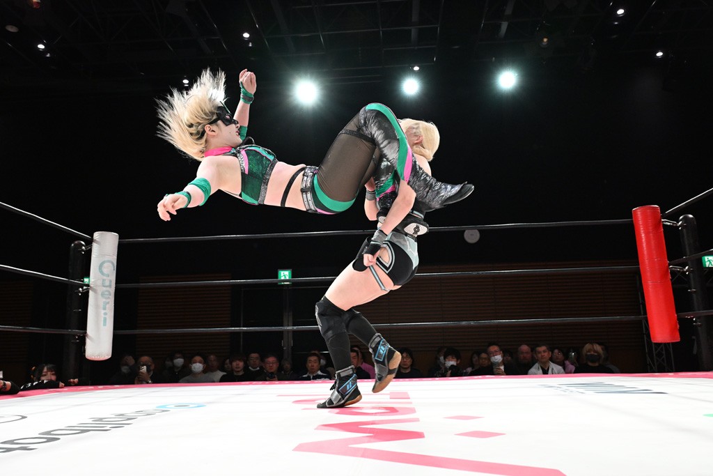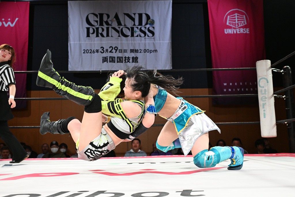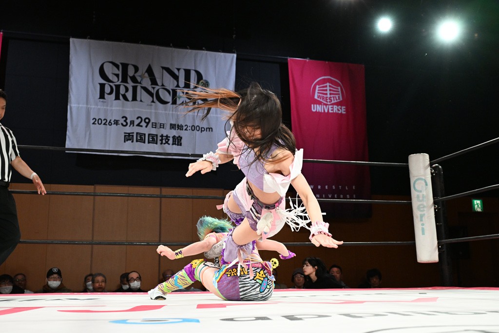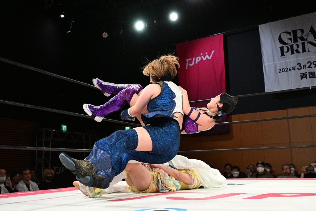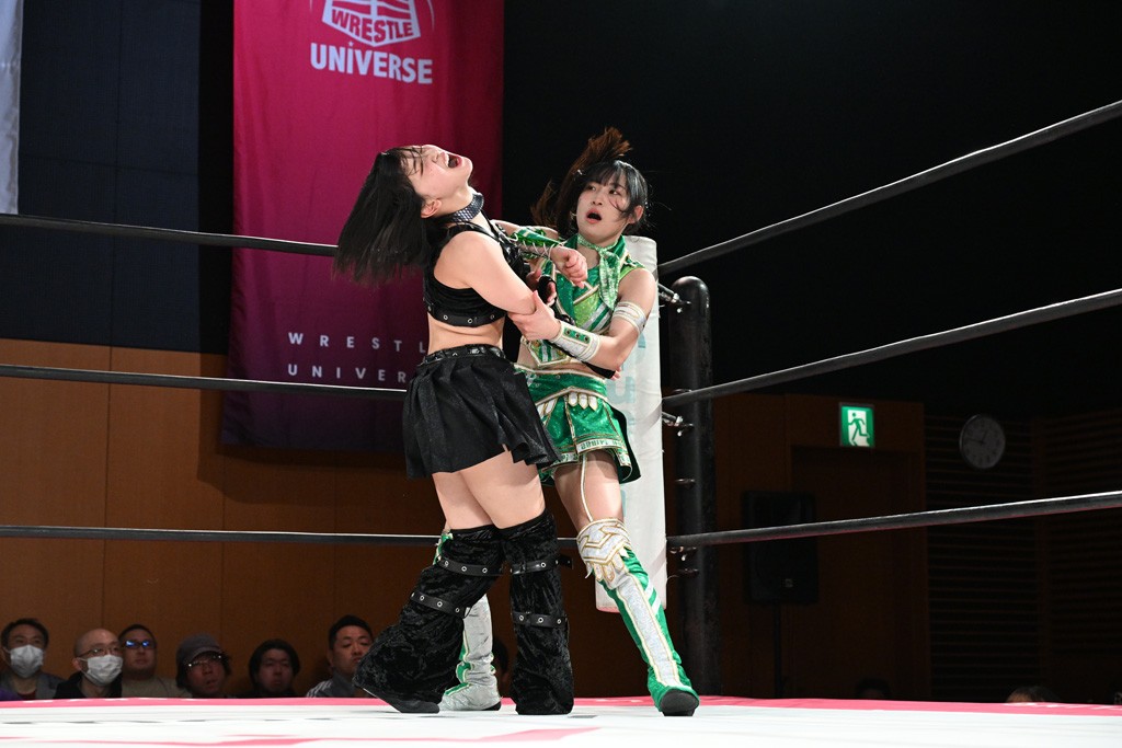 汐珠と志音がタッグ対決で両国国技館の前哨戦。その2人で試合開始。汐珠がバックを取ってグラウンドへ。立ち上がってバックエルボー。志音のヘッドシザースを抜けて両軍スイッチ。力比べからグラウンドを経て千花が自コーナーへ。志音を捕まえて志乃が観光案内し、串刺しバックエルボー。かわった汐珠は腕をきめると志音はエスケープ。ハンマースルーを拒否した志音がバックエルボー。5分経過。千花にかわって串刺しドロップキック。ランニング・エルボーはカウント2。稲荷鳥居は汐珠が脱してコアラクラッチ。回避されると丸め込んだが、カウント2。コーナー反転式ミサイルキックを放って志乃へ。ネックブリーカードロップは耐えた千花がエルボーを浴びせて志音にスイッチ。ロープに走ってドロップキックはカウント2。さらにスリーパーをエルボーで脱した志乃を丸め込む。カウント2。ランニング・バックエルボーからスリーパーで捕獲。しかし、志乃が脱出して胴絞めスリーパー。汐珠がドロップキックでカットに入った千花を排除。千花のベリー・トゥ・ベリーに志音がエルボーで抵抗するも、志乃がドロップキックからのベリー・トゥ・ベリーで3カウント奪取。