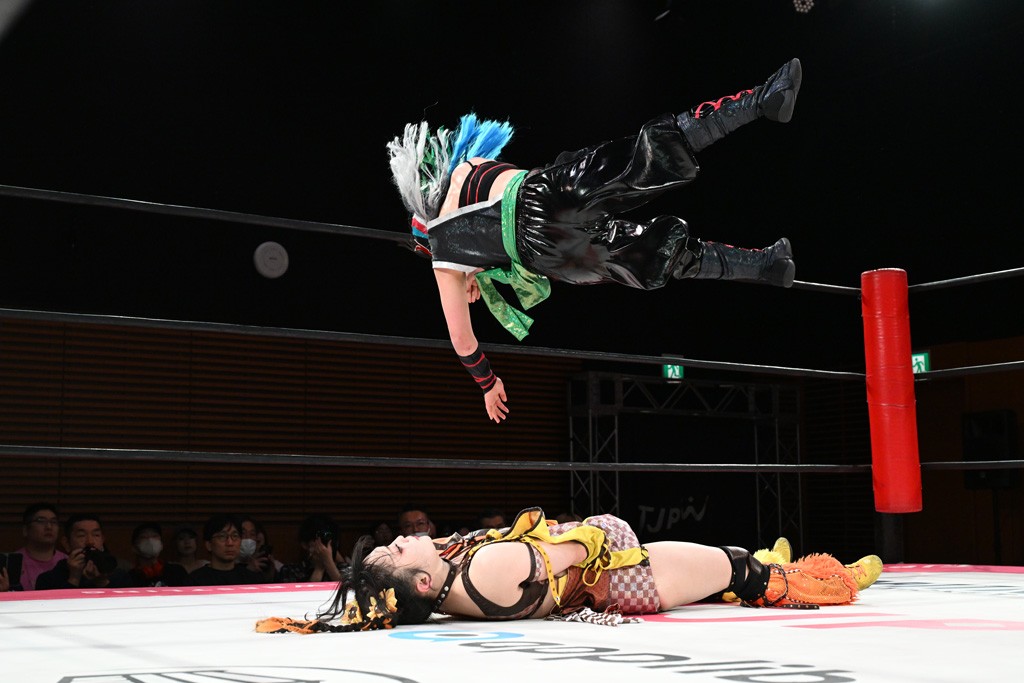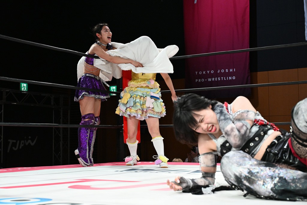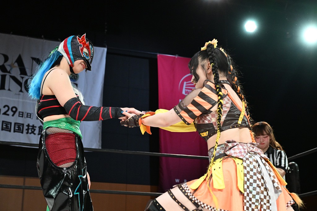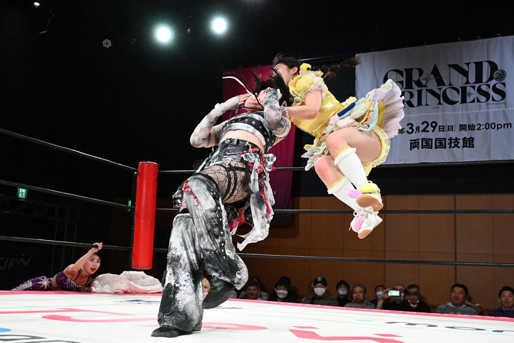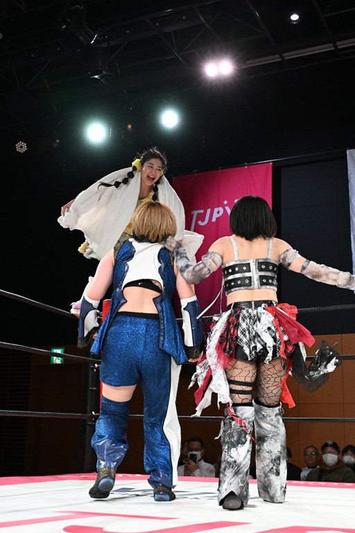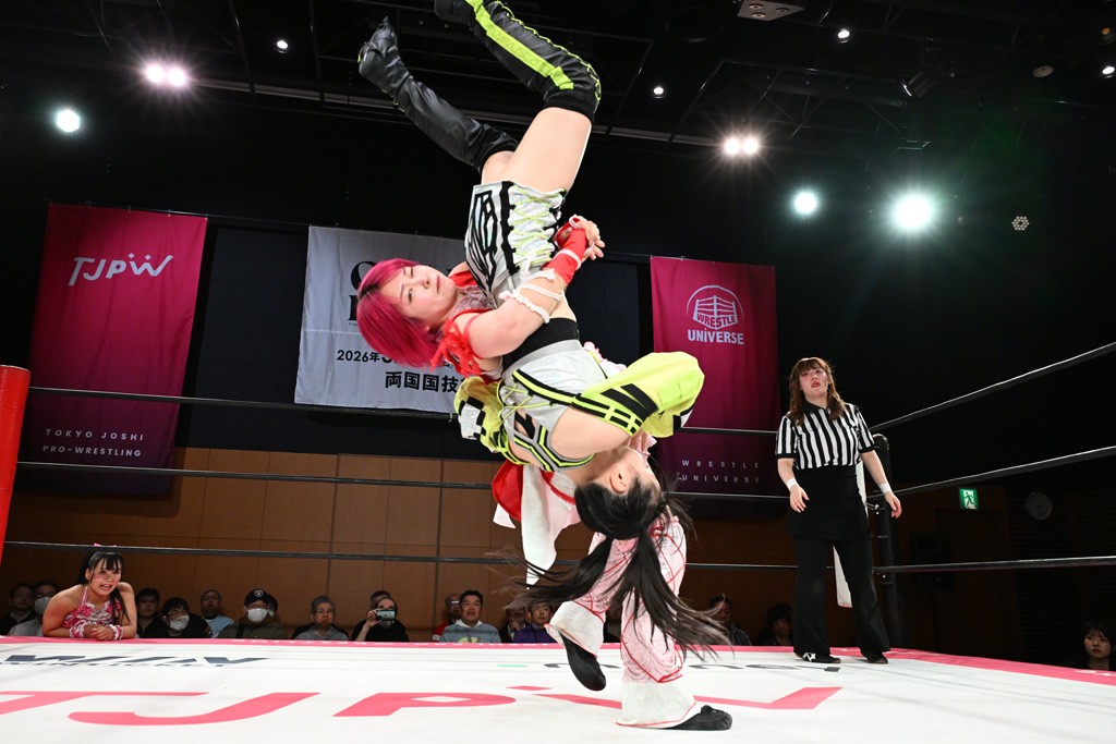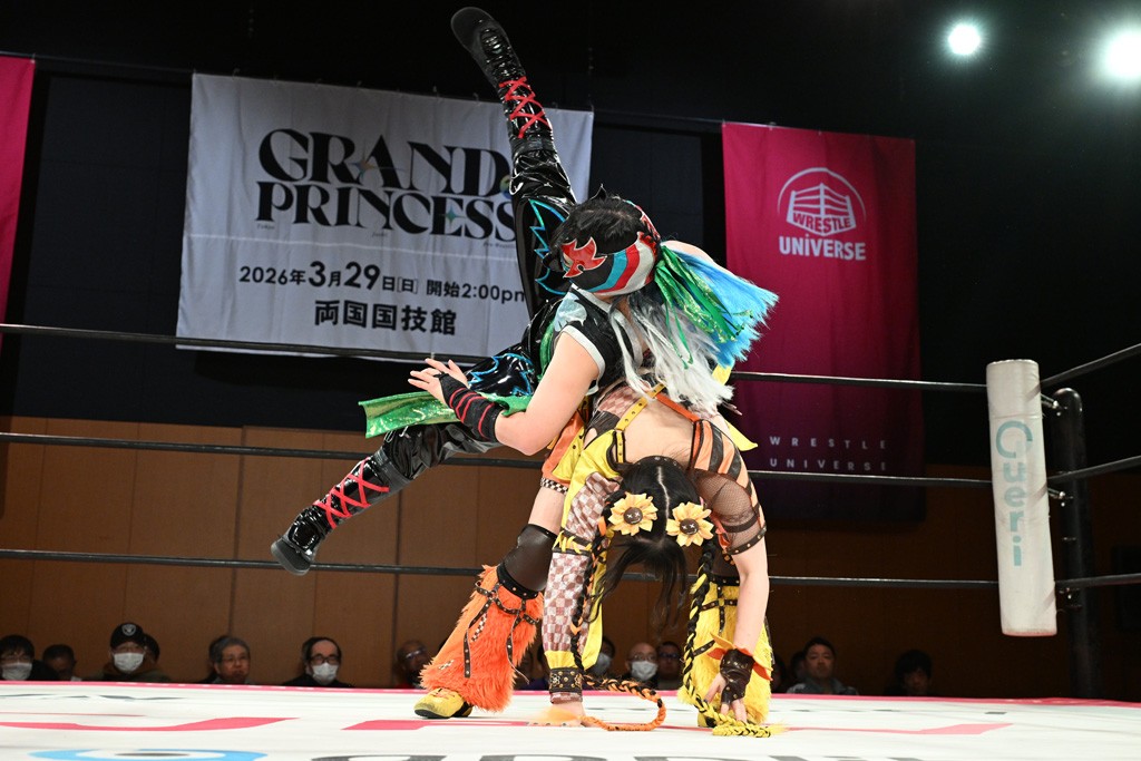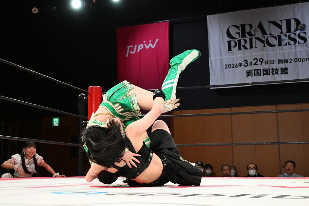汐珠と志音がタッグ対決で両国国技館の前哨戦。その2人で試合開始。汐珠がバックを取ってグラウンドへ。立ち上がってバックエルボー。志音のヘッドシザースを抜けて両軍スイッチ。力比べからグラウンドを経て千花が自コーナーへ。志音を捕まえて志乃が観光案内し、串刺しバックエルボー。かわった汐珠は腕をきめると志音はエスケープ。ハンマースルーを拒否した志音がバックエルボー。5分経過。千花にかわって串刺しドロップキック。ランニング・エルボーはカウント2。稲荷鳥居は汐珠が脱してコアラクラッチ。回避されると丸め込んだが、カウント2。コーナー反転式ミサイルキックを放って志乃へ。ネックブリーカードロップは耐えた千花がエルボーを浴びせて志音にスイッチ。ロープに走ってドロップキックはカウント2。さらにスリーパーをエルボーで脱した志乃を丸め込む。カウント2。ランニング・バックエルボーからスリーパーで捕獲。しかし、志乃が脱出して胴絞めスリーパー。汐珠がドロップキックでカットに入った千花を排除。千花のベリー・トゥ・ベリーに志音がエルボーで抵抗するも、志乃がドロップキックからのベリー・トゥ・ベリーで3カウント奪取。