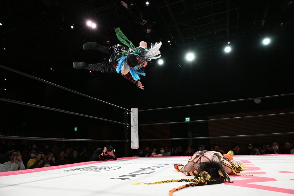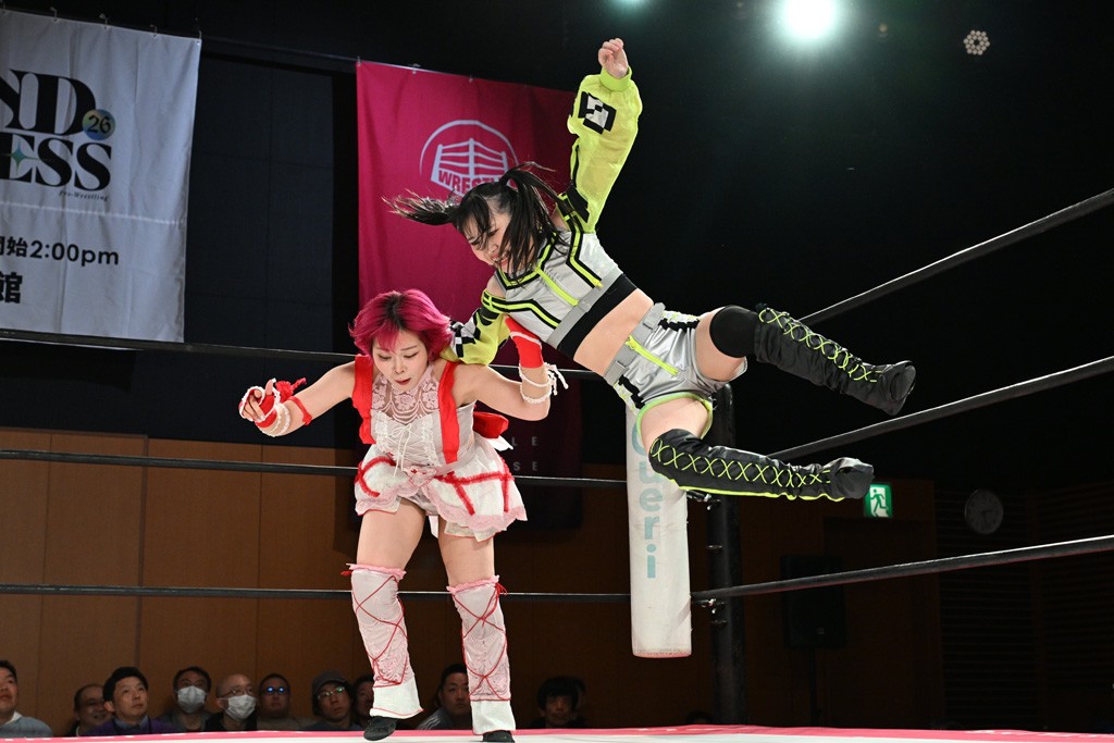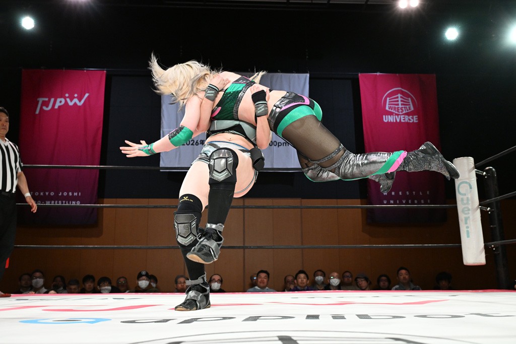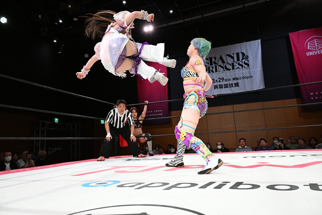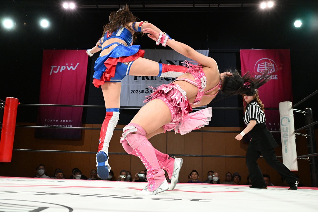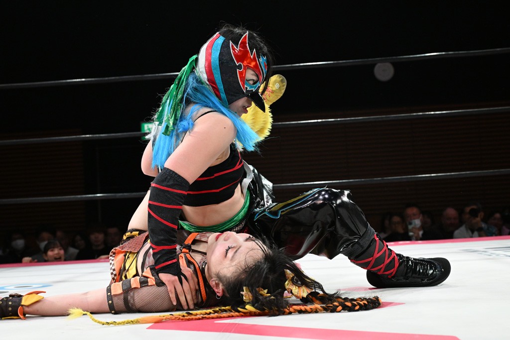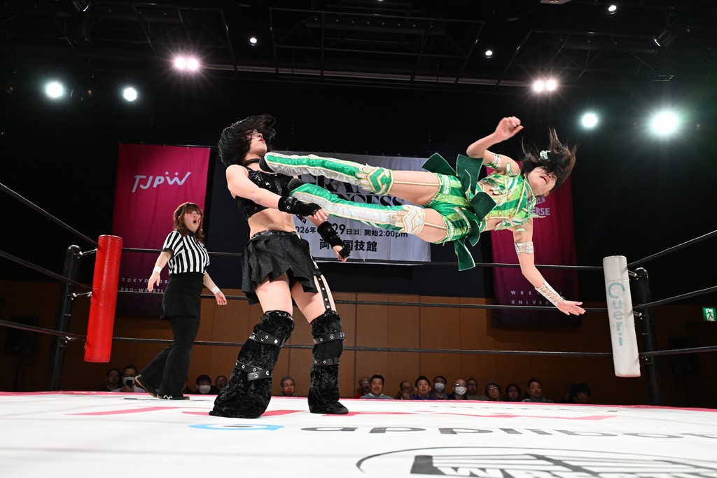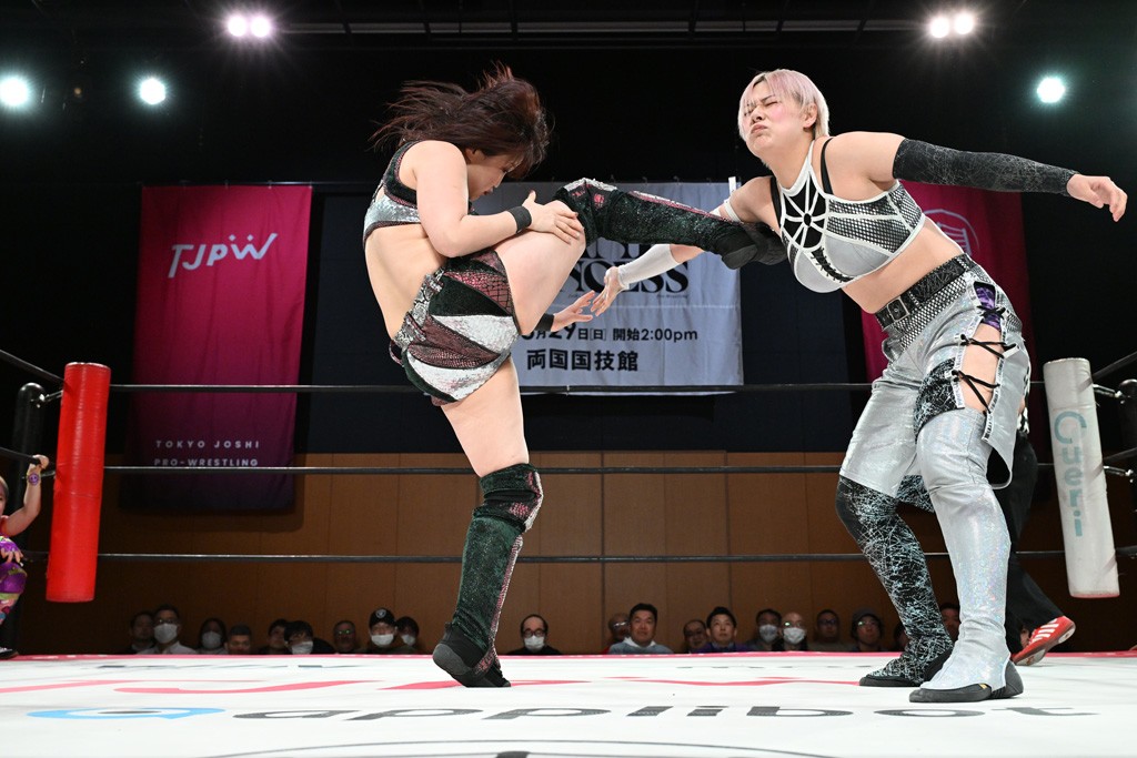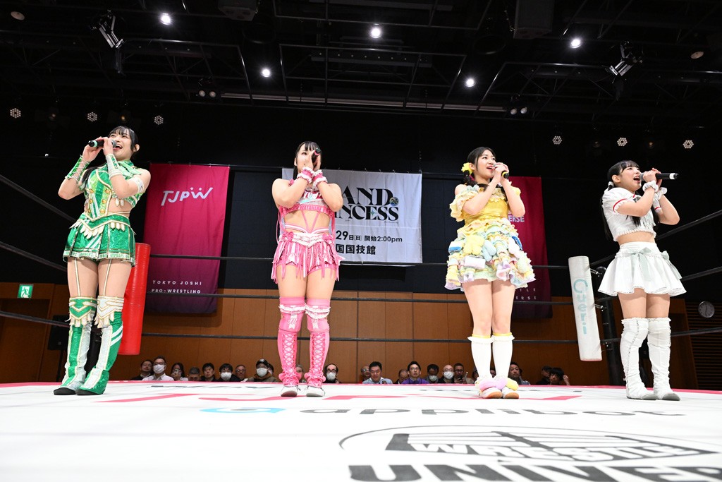 汐珠と志音がタッグ対決で両国国技館の前哨戦。その2人で試合開始。汐珠がバックを取ってグラウンドへ。立ち上がってバックエルボー。志音のヘッドシザースを抜けて両軍スイッチ。力比べからグラウンドを経て千花が自コーナーへ。志音を捕まえて志乃が観光案内し、串刺しバックエルボー。かわった汐珠は腕をきめると志音はエスケープ。ハンマースルーを拒否した志音がバックエルボー。5分経過。千花にかわって串刺しドロップキック。ランニング・エルボーはカウント2。稲荷鳥居は汐珠が脱してコアラクラッチ。回避されると丸め込んだが、カウント2。コーナー反転式ミサイルキックを放って志乃へ。ネックブリーカードロップは耐えた千花がエルボーを浴びせて志音にスイッチ。ロープに走ってドロップキックはカウント2。さらにスリーパーをエルボーで脱した志乃を丸め込む。カウント2。ランニング・バックエルボーからスリーパーで捕獲。しかし、志乃が脱出して胴絞めスリーパー。汐珠がドロップキックでカットに入った千花を排除。千花のベリー・トゥ・ベリーに志音がエルボーで抵抗するも、志乃がドロップキックからのベリー・トゥ・ベリーで3カウント奪取。