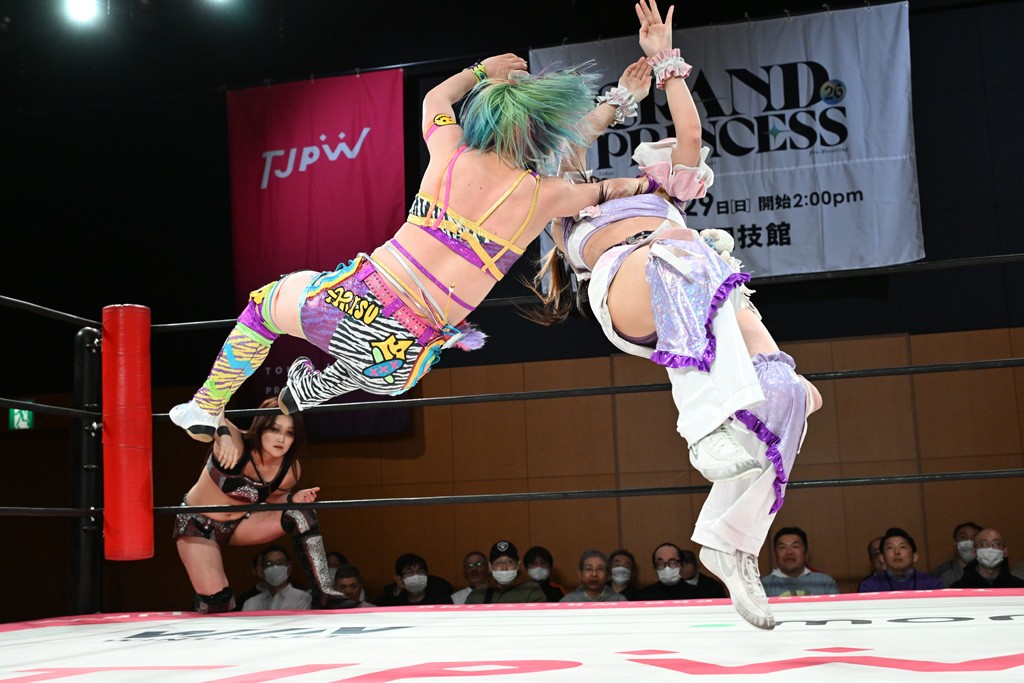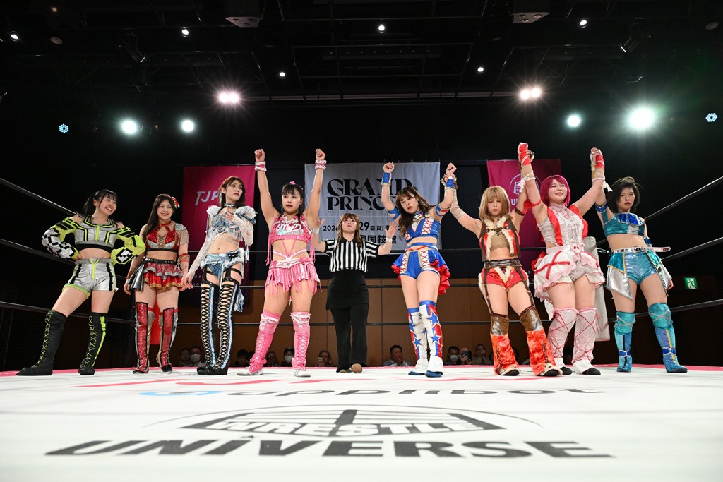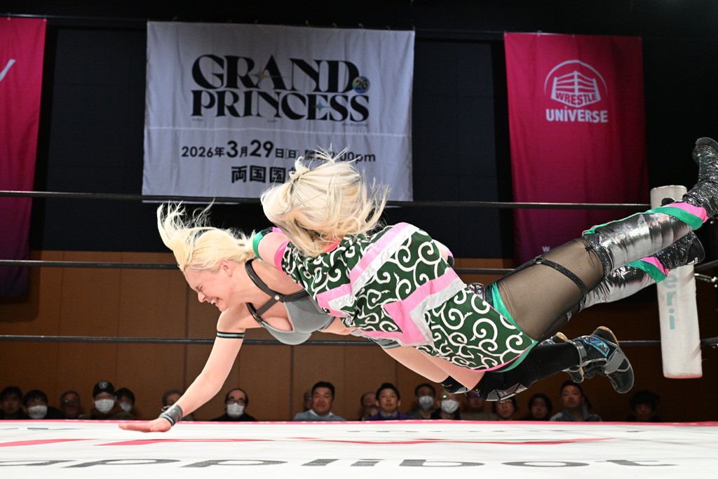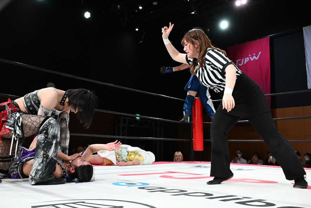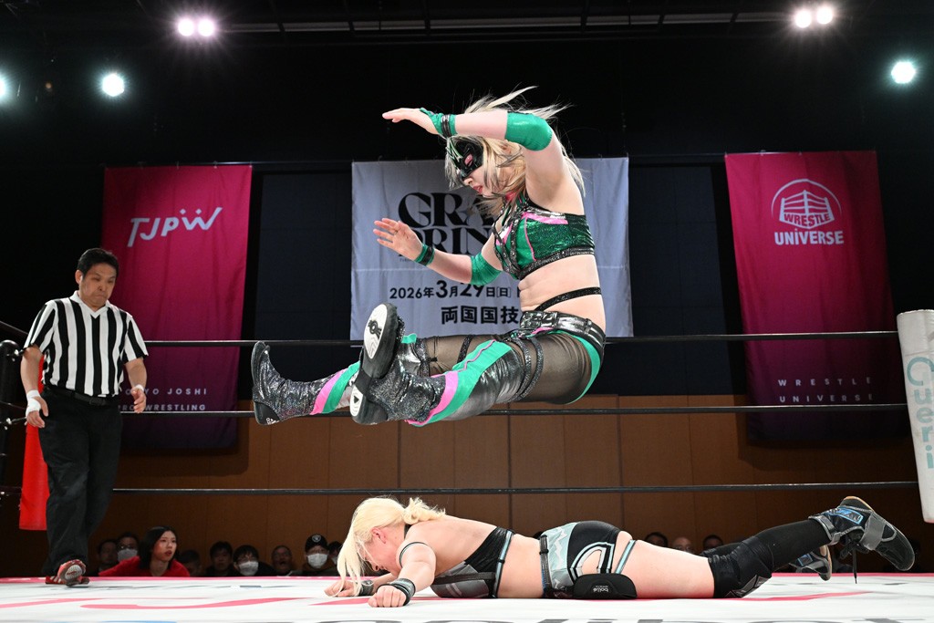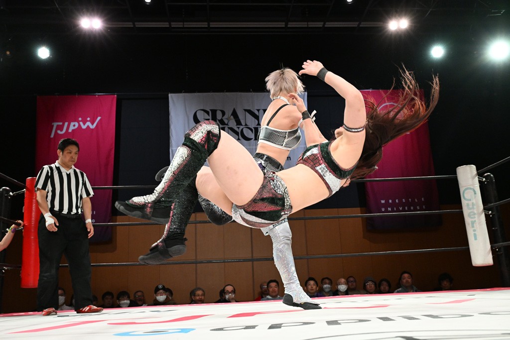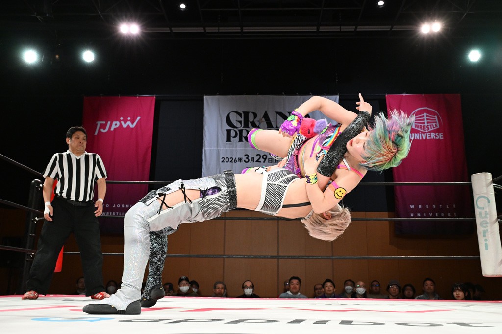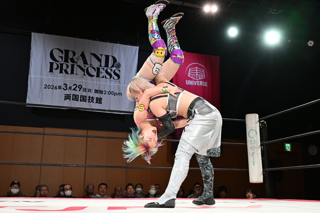 汐珠と志音がタッグ対決で両国国技館の前哨戦。その2人で試合開始。汐珠がバックを取ってグラウンドへ。立ち上がってバックエルボー。志音のヘッドシザースを抜けて両軍スイッチ。力比べからグラウンドを経て千花が自コーナーへ。志音を捕まえて志乃が観光案内し、串刺しバックエルボー。かわった汐珠は腕をきめると志音はエスケープ。ハンマースルーを拒否した志音がバックエルボー。5分経過。千花にかわって串刺しドロップキック。ランニング・エルボーはカウント2。稲荷鳥居は汐珠が脱してコアラクラッチ。回避されると丸め込んだが、カウント2。コーナー反転式ミサイルキックを放って志乃へ。ネックブリーカードロップは耐えた千花がエルボーを浴びせて志音にスイッチ。ロープに走ってドロップキックはカウント2。さらにスリーパーをエルボーで脱した志乃を丸め込む。カウント2。ランニング・バックエルボーからスリーパーで捕獲。しかし、志乃が脱出して胴絞めスリーパー。汐珠がドロップキックでカットに入った千花を排除。千花のベリー・トゥ・ベリーに志音がエルボーで抵抗するも、志乃がドロップキックからのベリー・トゥ・ベリーで3カウント奪取。