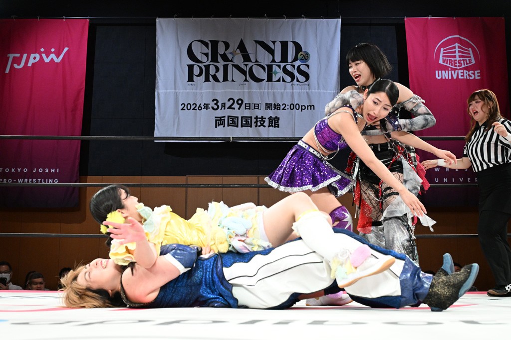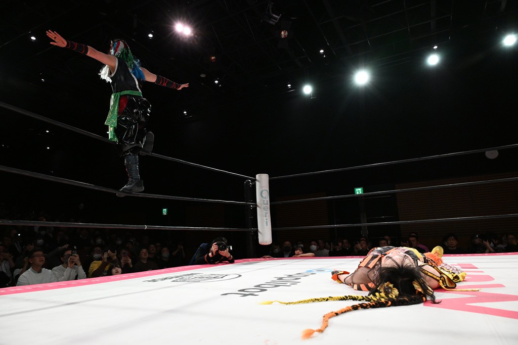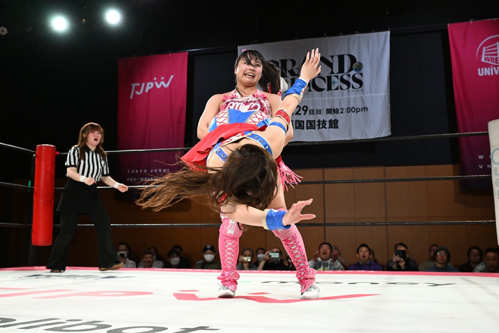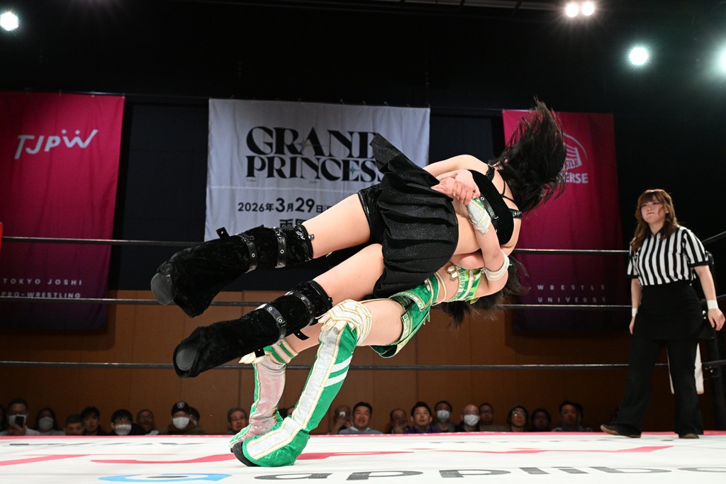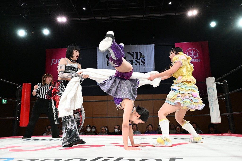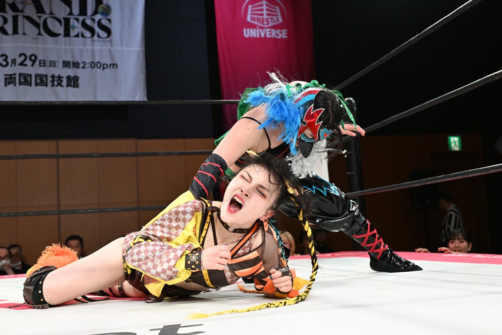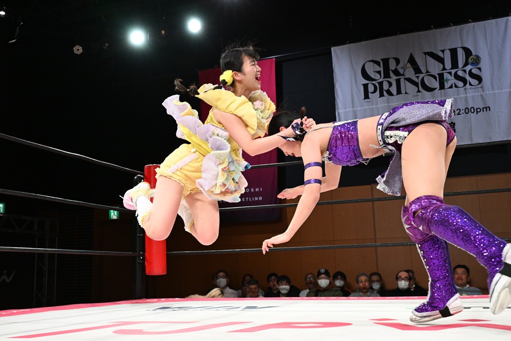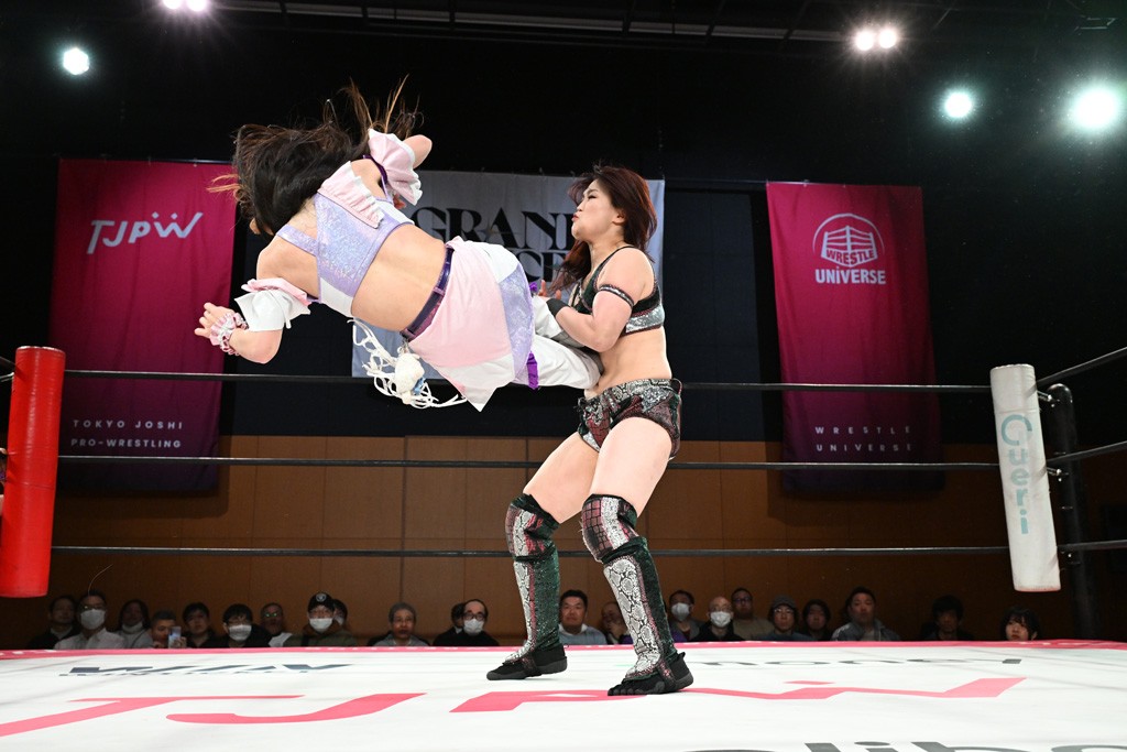 汐珠と志音がタッグ対決で両国国技館の前哨戦。その2人で試合開始。汐珠がバックを取ってグラウンドへ。立ち上がってバックエルボー。志音のヘッドシザースを抜けて両軍スイッチ。力比べからグラウンドを経て千花が自コーナーへ。志音を捕まえて志乃が観光案内し、串刺しバックエルボー。かわった汐珠は腕をきめると志音はエスケープ。ハンマースルーを拒否した志音がバックエルボー。5分経過。千花にかわって串刺しドロップキック。ランニング・エルボーはカウント2。稲荷鳥居は汐珠が脱してコアラクラッチ。回避されると丸め込んだが、カウント2。コーナー反転式ミサイルキックを放って志乃へ。ネックブリーカードロップは耐えた千花がエルボーを浴びせて志音にスイッチ。ロープに走ってドロップキックはカウント2。さらにスリーパーをエルボーで脱した志乃を丸め込む。カウント2。ランニング・バックエルボーからスリーパーで捕獲。しかし、志乃が脱出して胴絞めスリーパー。汐珠がドロップキックでカットに入った千花を排除。千花のベリー・トゥ・ベリーに志音がエルボーで抵抗するも、志乃がドロップキックからのベリー・トゥ・ベリーで3カウント奪取。