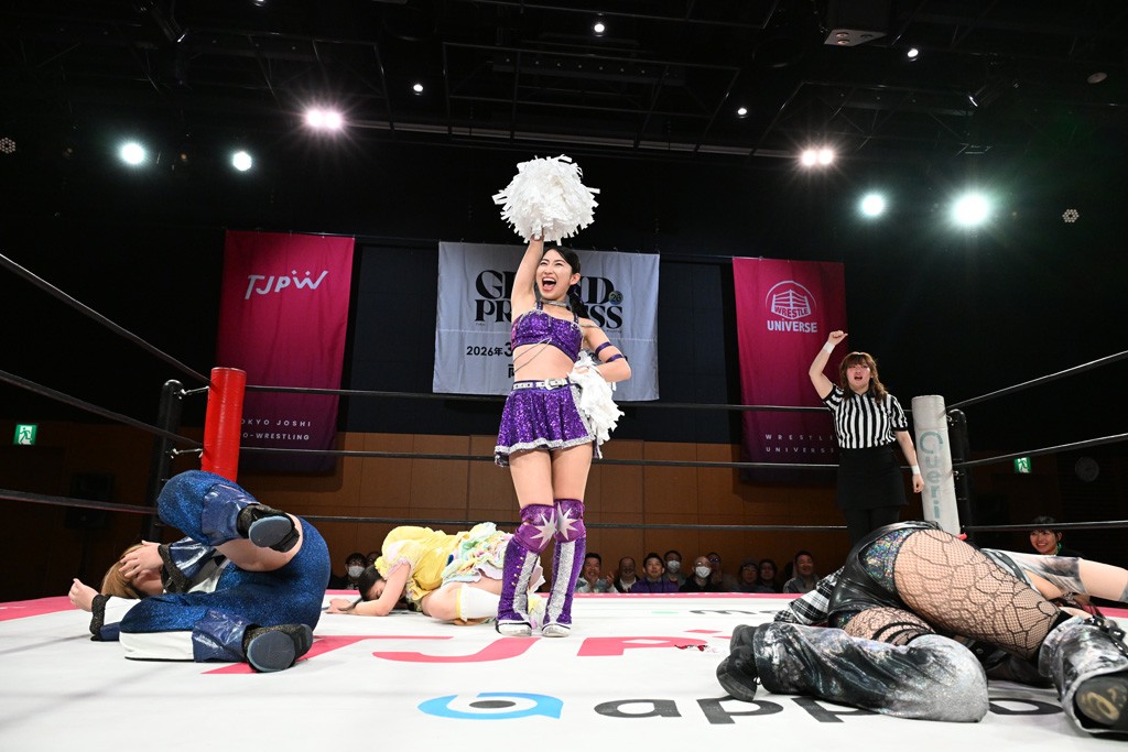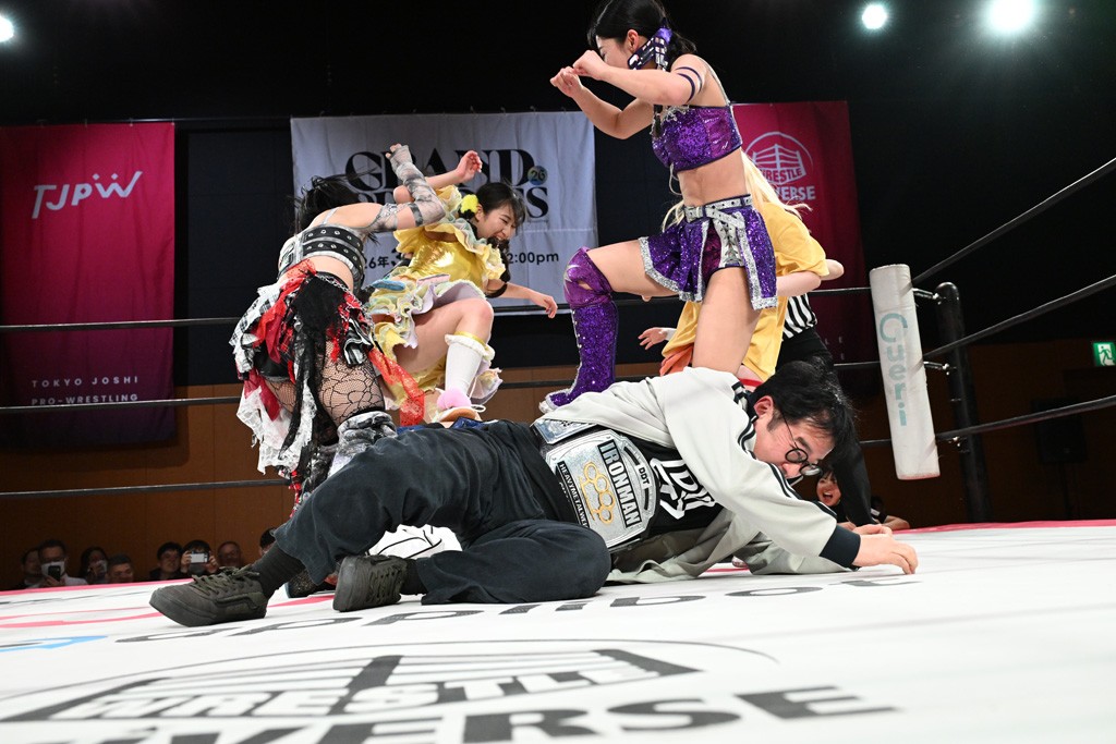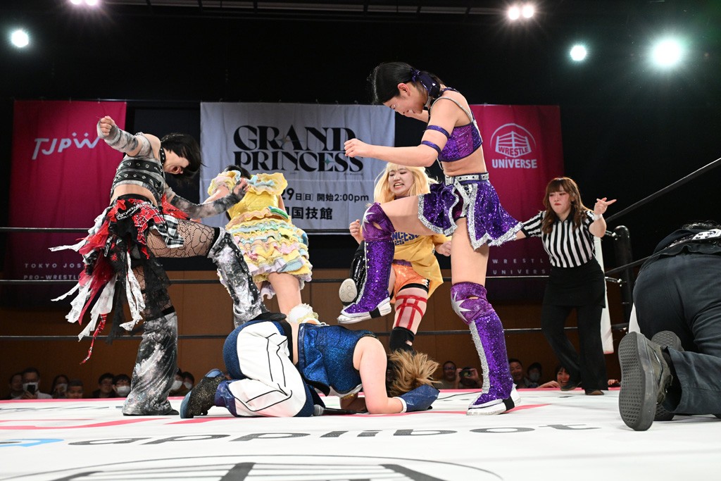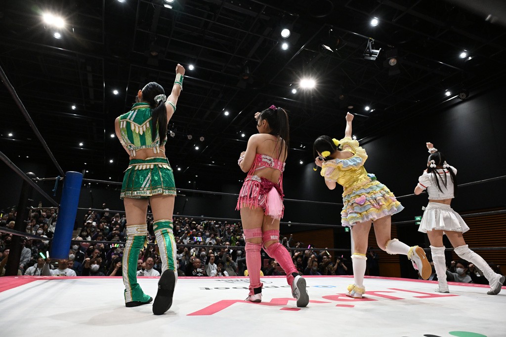 4人が握手してゴング。真弥の誘いでリカを集中砲火。3人でおやすみエクスプレス&おやすみなさいフォールを決める。カウント2でキックアウトしたリカが3人に怒りの張り手。3人を寝かせてのよっしゃいくぞエルボーは芦田だけ回避。カウント2。続いてリカらがトーキック合戦。そこに芦田がボンボン攻撃でダウンさせてチアを披露。リカらにビッグブーツを浴びせていく。真弥にはY字絞首刑で絞め上げる。Y字ギロチンはカウント2。ハイキックをかわした真弥が「変なチアガールを連れてきて申し訳ございません」と謝罪も、背後かららくが丸め込む。カウント2。ニーストライクにリカが横取りフォール。リカと真弥が揉めだすとそこにらくがコーナーダイブのクロスボディー。布団攻撃は芦田が割って入って2人まとめて串刺しスピンキック。らくへのY字ギロチンはカウント2。5分経過。鎌固めはらくがロープエスケープ。ハイキックをかわしてらくがフェースクラッシャー、ぽっぽーチョップ!!、スーパービュー踊り子でたたみかける。ここでカットに入った真弥が2人まとめて逆片エビ固めを決めると、リカがヒップアタックでカット。真弥にドラゴンスクリューから足4の字固め。決まらないとみるやヒップアタック。続くバックドロップは真弥が耐えて後頭部にエルボー。スパインバスターはリカが延髄斬りで応戦。ツイスト・オブ・フェイトはカットに入ったらくがかがやきを放つと、芦田が布団でらくを視界不能にさせる。すかさず芦田が丸め込むもカウント2。真弥が芦田を捕まえてサイドバスターでらくの上に投下。さらにコーナーからの謝罪ニーにはリカが芦田をどかしていたことに気づかず自爆。直後にリカが真弥にホワイト・ドラゴンスリーパーでギブアップを奪った。