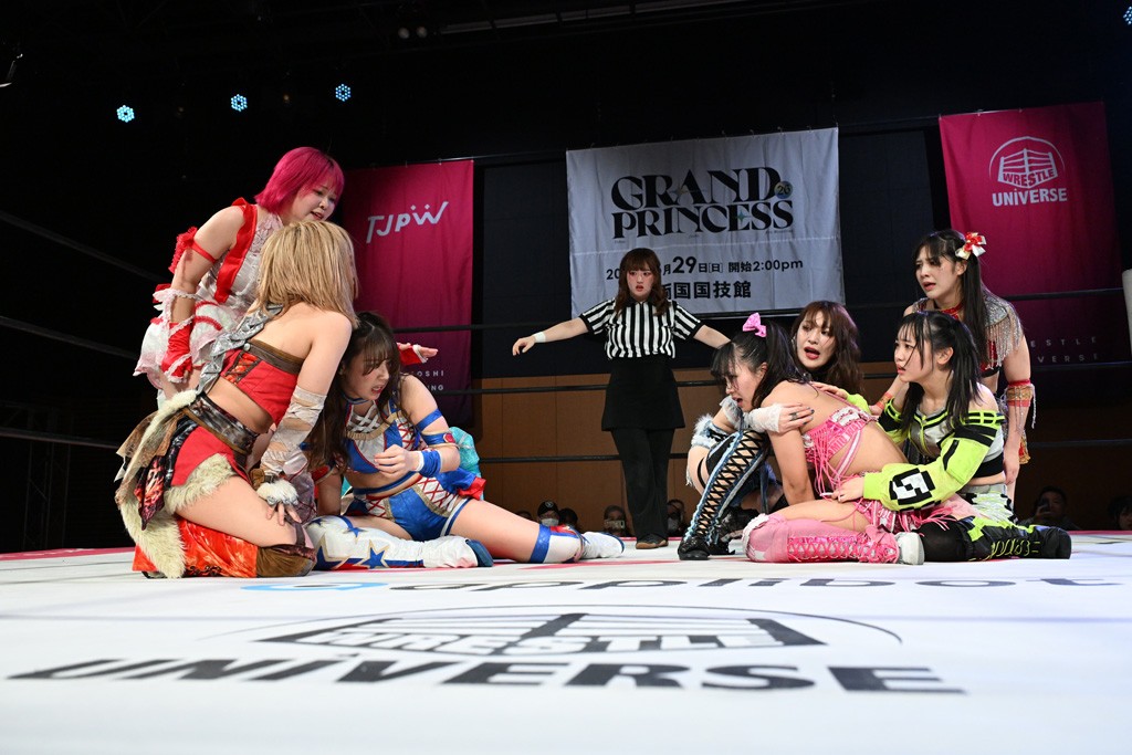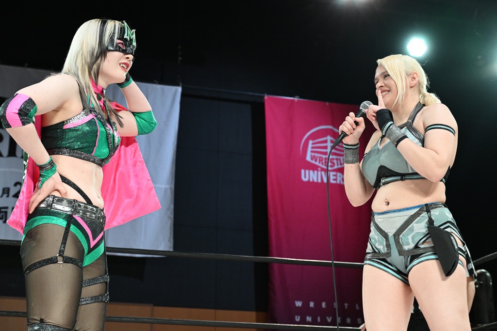 荒井&東女特撮部は『炎神戦隊ゴーオンジャー』で入場。未詩と荒井が握手し、荒井が接近。その2人でゴング。ロックアップから荒井がバックを取り返すと、未詩がグラウンドへ誘う。荒井のヘッドロックに未詩がバックへ。立ち上がった未詩が荒井のドロップダウンにショルダータックル。両者が離れると東女特撮部にスイッチ。「合体だ!」とハルとユキが肩車を作るが、荒井は自コーナーで待機。これに中島が「やったことがないから諦めるんじゃない!」と諭されて、荒井が肩車の一番下へ。中島がコーナーを登りだすが、やはり崩壊。上福がハルに串刺しビッグブーツからドロップキック。さらに上原との合体サブミッションを披露。かわった上原がスペース・ローリングエルボー。これにハルがドロップキックで反撃して荒井にスイッチ。コーナーの鈴芽にビッグブーツでけん制し、上原にバックエルボー。上原がスナップ・スープレックスで投げ返す。かわった上福に串刺しビッグブーツを放って中島へ。619は避けられて上福がトップロープ越えビッグブーツを食らうが、突進を自爆させてスワンダイブのハリケーンラナ。10分経過。ノーザンライトSHは上福がブレーンバスターで投げ捨てる。OberEatsが合体のフラップジャックを決めると、3人がいっせいにカット。上原が中島の619を浴びるも、エルボーを打ち込んで両軍スイッチ。ユキは鈴芽のドロップキックに仁王立ちして受け流すと、セントーン投下。エルボー合戦から鈴芽が丸め込み連発。カウント2。さらにコーナーを使ってフェースクラッシャー。ミカヅキ流星群はハルがカットしてユキがサイドスープレックス。さらにハルと合体技を決めていく。かわったハルが低空クロスボディー。鈴芽のハチノス・エイトノットに捕まるも、ハルが腕にコードブレイカーからストレート・アームバー。これをエルボーで脱した鈴芽に十六夜で捕獲。10分経過。ロープエスケープした鈴芽がフェースクラッシャー。両軍スイッチし、未詩が中島にショルダータックル、コーナースプラッシュ。ショルダータックルとたたみかける。カナディアン・バックブリーカーは着地した中島が逆さ押さえ込みからヘッドロックで捕らえると、パワーで未詩が再びカナディアンへ。これを着地した中島がレーザービームを浴びるが、ライダーキックで一撃して荒井にスイッチ。串刺しビッグブーツからフルネルソンはクラッチを切られるも、再びフルネルソンの体勢。未詩は足でロープエスケープ。荒井の突進に未詩がエルボー。入れ替わるように荒井がエルボー。再び両者はエルボー合戦。未詩が渾身のエルボーから荒井のビッグブーツをかわして振り子式バックブリーカー。ジャイアントスイングは抵抗にあって決められず。ならばと持ち上げようとするが、これも荒井が抵抗。15分経過。エルボー連打してカナディアン・バックブリーカー。荒井がエプロンに降り立つと鈴芽がフェースクラッシャーを食らわせる。リング内では中島が割って入って未詩を場外追放。OberEatsが合体ビッグブーツを放つと、上福のフェイマサーとユキのヴィーナスDDTが同時に決まる。誰もいなくなったリングに荒井と未詩がリングイン。残り時間3分。両者がにらみ合ってから未詩がエルボー。荒井もエルボーで応戦。2発、3発とエルボー合戦。残り時間1分。バッティングハンマーはカウント1でキックアウトした荒井がビッグブーツ。フルネルソンバスターを脱した未詩が突進すると、荒井がカウンターのビッグブーツ。残り30秒。荒井のサソリ固めに未詩が脚力で脱してリバース・ジャイアントスイング。気合で立ち上がった荒井がフルネルソンバスターで投げ捨てると、ドローのゴングが鳴った。試合後も両者はロックアップでやり合うと味方陣営が2人を分けた。