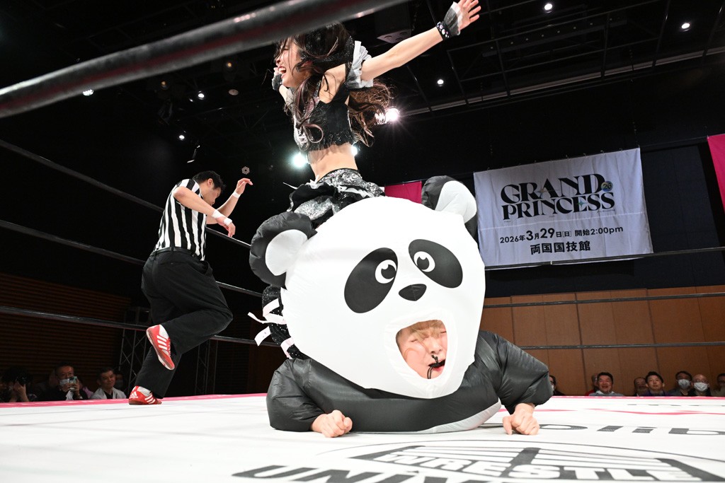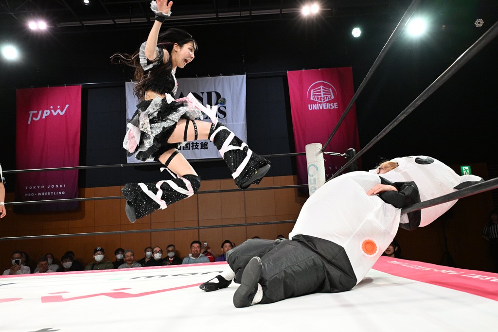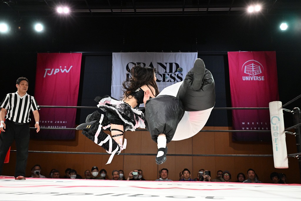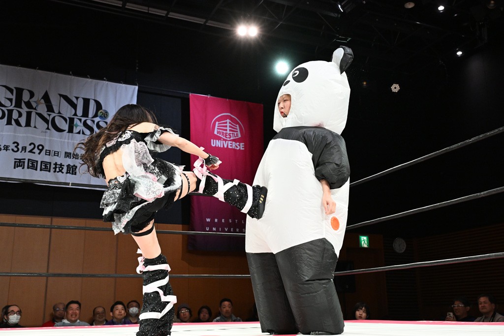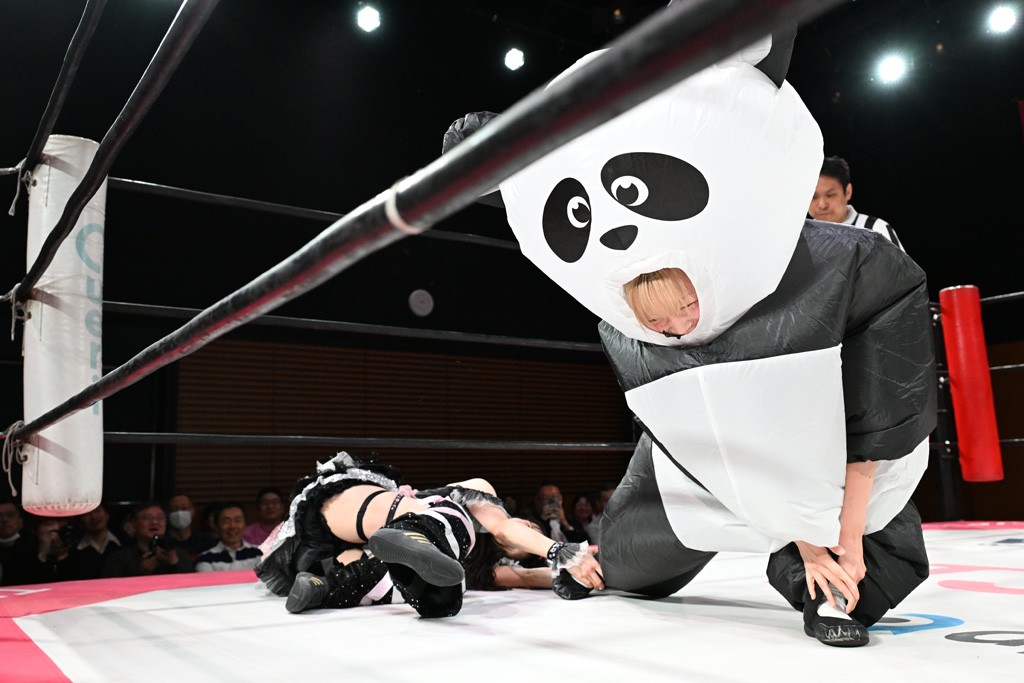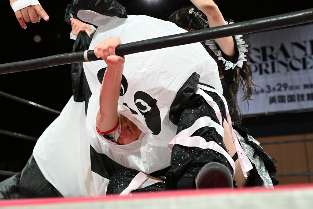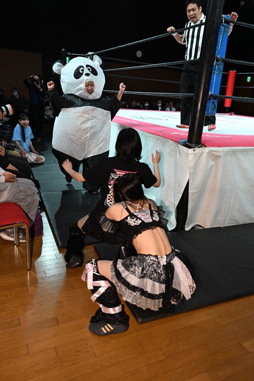ぽむがパンダのエアー着ぐるみで登場。ゴングが鳴るやぽむが突進を瑞希がかわしていく。瑞希のトーキックにもびくともせず。突進をカウンターのショルダータックルを浴びせ、でんでん太鼓はカウント2。場外エスケープした瑞希を追って場外乱闘開始。客席までなだれ込むもエアー着ぐるみの大きさから通路を通れない。やっとリングインしたぽむに対し、ピコピコハンマーの柄の部分にぽむの靴をはめてハンマー替わりに殴打しようとすると、シューズが飛んで客席へ。その隙にぽむがシューズを履き直して、スティンクフェース。カバーはブリッジで脱した瑞希がフットスタンプ、ネックブリーカードロップ、セカンドロープからすり抜けるドロップキックとたたみかける。5分経過。コーナーダイブのクロスボディーはカウント2。クロスフェースはぽむがロープエスケープし、スネ蹴りを連打するも、エアー着ぐるみのチャックがバレてしまう。すかさずぽむが丸め込むも、カウント2となってエアー着ぐるみを脱ぐと瑞希の足へドロップキック。エプロンからぽむ・ど・じゃすてぃすをカウント2で返した瑞希がエアー着ぐるみの残骸で殴打し、そのままチョーク攻撃。フォールは認められず、レフェリーに投げつけていく。ブレーンバスターはぽむが耐えて丸め込み合戦。カウント2。串刺し攻撃を迎撃したぽむがミサイルキック。ぽむのすね蹴りを瑞希がシューズを脱がすと、2人がチャンバラ。10分経過。瑞希がシューズ攻撃のフェイントを入れてドロップキック。最後はシューズを客席へ投げ捨てから、キューティースペシャルで勝負あり。もう1足のシューズも客席に投げ捨てた。