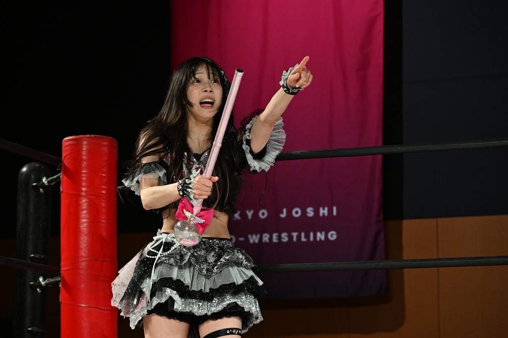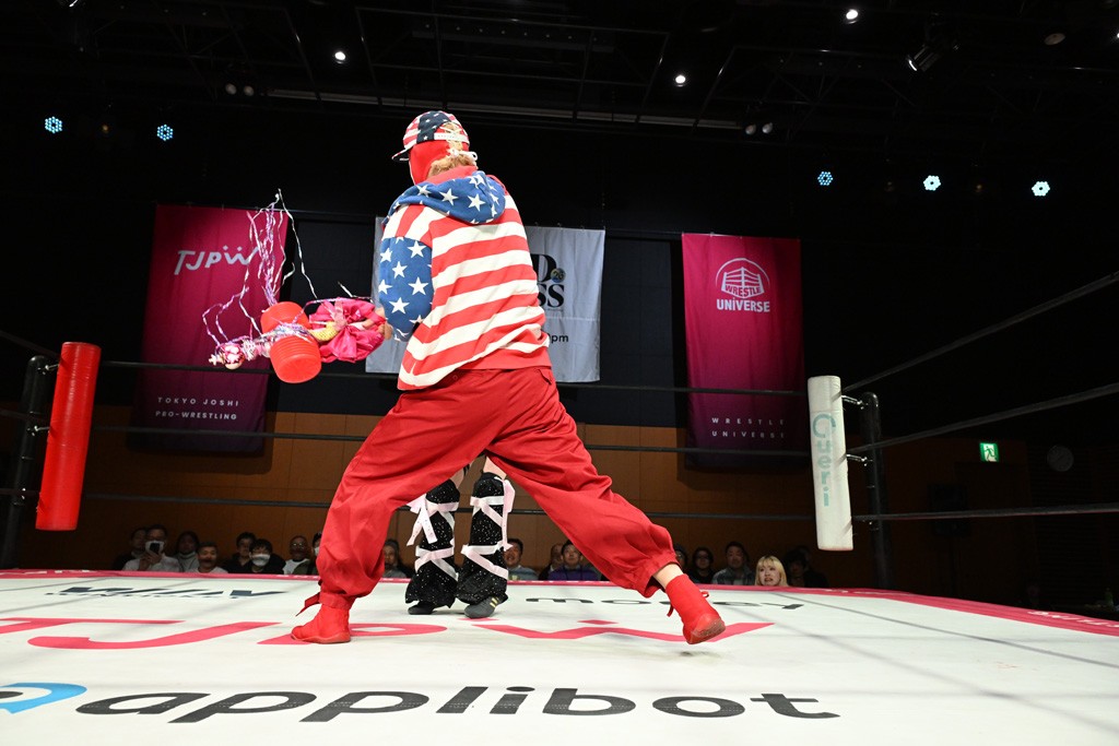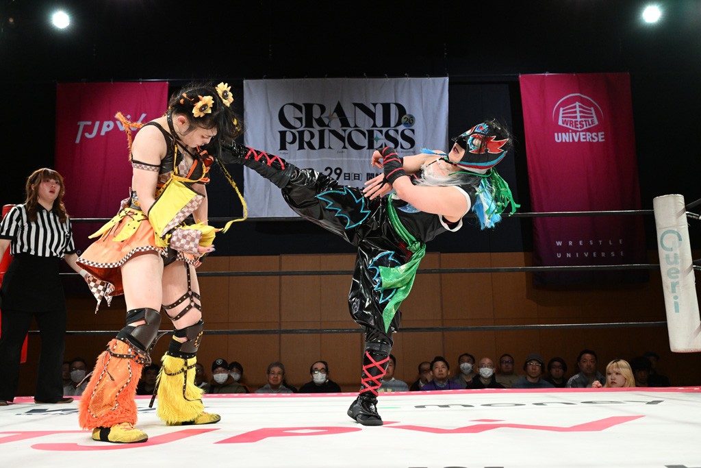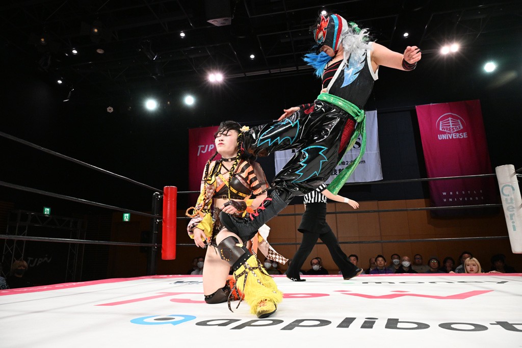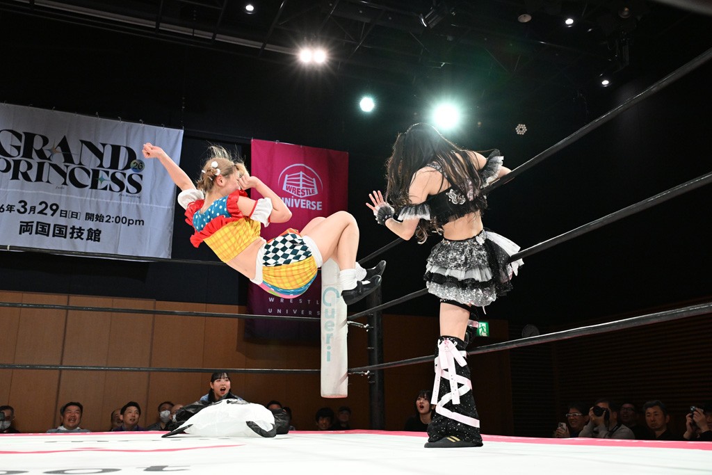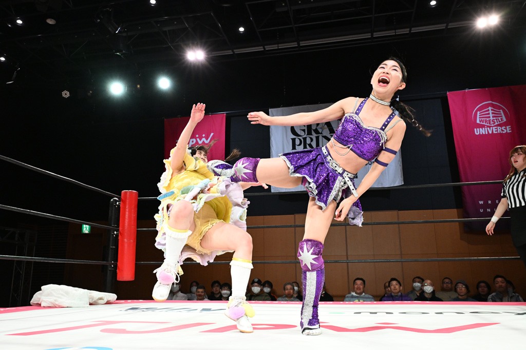 ぽむがパンダのエアー着ぐるみで登場。ゴングが鳴るやぽむが突進を瑞希がかわしていく。瑞希のトーキックにもびくともせず。突進をカウンターのショルダータックルを浴びせ、でんでん太鼓はカウント2。場外エスケープした瑞希を追って場外乱闘開始。客席までなだれ込むもエアー着ぐるみの大きさから通路を通れない。やっとリングインしたぽむに対し、ピコピコハンマーの柄の部分にぽむの靴をはめてハンマー替わりに殴打しようとすると、シューズが飛んで客席へ。その隙にぽむがシューズを履き直して、スティンクフェース。カバーはブリッジで脱した瑞希がフットスタンプ、ネックブリーカードロップ、セカンドロープからすり抜けるドロップキックとたたみかける。5分経過。コーナーダイブのクロスボディーはカウント2。クロスフェースはぽむがロープエスケープし、スネ蹴りを連打するも、エアー着ぐるみのチャックがバレてしまう。すかさずぽむが丸め込むも、カウント2となってエアー着ぐるみを脱ぐと瑞希の足へドロップキック。エプロンからぽむ・ど・じゃすてぃすをカウント2で返した瑞希がエアー着ぐるみの残骸で殴打し、そのままチョーク攻撃。フォールは認められず、レフェリーに投げつけていく。ブレーンバスターはぽむが耐えて丸め込み合戦。カウント2。串刺し攻撃を迎撃したぽむがミサイルキック。ぽむのすね蹴りを瑞希がシューズを脱がすと、2人がチャンバラ。10分経過。瑞希がシューズ攻撃のフェイントを入れてドロップキック。最後はシューズを客席へ投げ捨てから、キューティースペシャルで勝負あり。もう1足のシューズも客席に投げ捨てた。