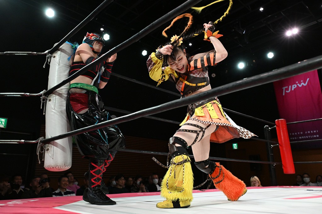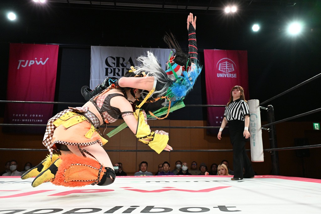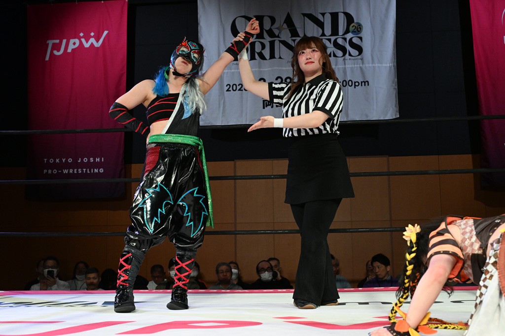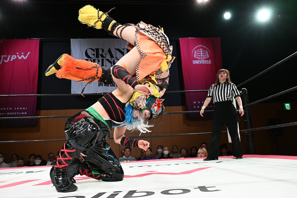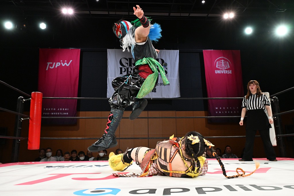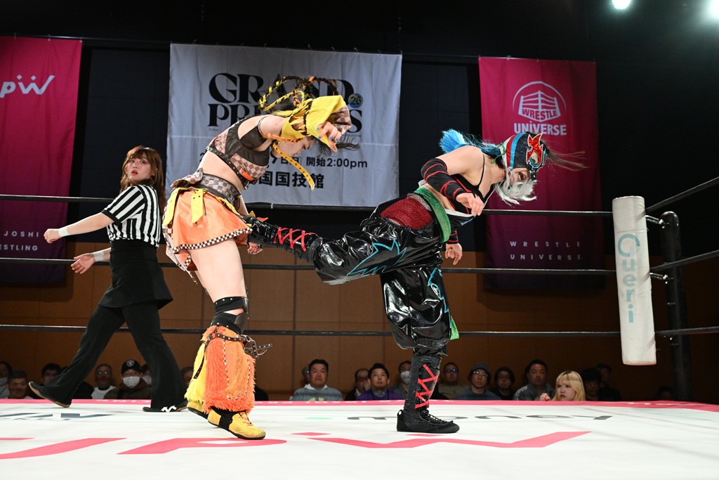 ぽむがパンダのエアー着ぐるみで登場。ゴングが鳴るやぽむが突進を瑞希がかわしていく。瑞希のトーキックにもびくともせず。突進をカウンターのショルダータックルを浴びせ、でんでん太鼓はカウント2。場外エスケープした瑞希を追って場外乱闘開始。客席までなだれ込むもエアー着ぐるみの大きさから通路を通れない。やっとリングインしたぽむに対し、ピコピコハンマーの柄の部分にぽむの靴をはめてハンマー替わりに殴打しようとすると、シューズが飛んで客席へ。その隙にぽむがシューズを履き直して、スティンクフェース。カバーはブリッジで脱した瑞希がフットスタンプ、ネックブリーカードロップ、セカンドロープからすり抜けるドロップキックとたたみかける。5分経過。コーナーダイブのクロスボディーはカウント2。クロスフェースはぽむがロープエスケープし、スネ蹴りを連打するも、エアー着ぐるみのチャックがバレてしまう。すかさずぽむが丸め込むも、カウント2となってエアー着ぐるみを脱ぐと瑞希の足へドロップキック。エプロンからぽむ・ど・じゃすてぃすをカウント2で返した瑞希がエアー着ぐるみの残骸で殴打し、そのままチョーク攻撃。フォールは認められず、レフェリーに投げつけていく。ブレーンバスターはぽむが耐えて丸め込み合戦。カウント2。串刺し攻撃を迎撃したぽむがミサイルキック。ぽむのすね蹴りを瑞希がシューズを脱がすと、2人がチャンバラ。10分経過。瑞希がシューズ攻撃のフェイントを入れてドロップキック。最後はシューズを客席へ投げ捨てから、キューティースペシャルで勝負あり。もう1足のシューズも客席に投げ捨てた。