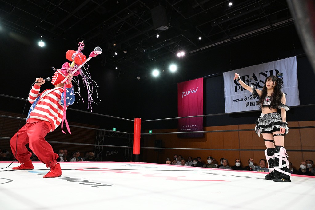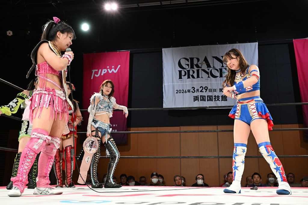 試合後、真弥がマイク。「待って、待って、みんな。本当にベルトどこにやったんですか? なんで持ってない? なんでだよ! 誰が持ってんだ?(場内の『今林さん』の声に)え? 今林さん? DDTの今林さん? DDTの方に渡っちゃったら、取り返すチャンスがないじゃないですか。さ、さっきいた?」リカ「売店にいるわ」真弥「なんで? 売店にいる? 千花、ちょっと!」すると千花が受付業務を手伝いに来ていた今林GMを連れてリングにあげる。らくがトラックジャケットのチャックを下ろすとアイアンマンベルトがしっかり腰に巻かれていた。真弥「あの、私たち両国国技館大会で、あの、アイアンマンのランブルがあるので返してください」今林「ダメだよ。だって3月22日のDDTの後楽園で俺、防衛戦決まっちゃっているから。ベルト取られたらまたカード変わっちゃうから。会社に迷惑かかるから無理だよ」真弥「いやいやいやいや、そんな会社に迷惑とか、そんなこと言ってんじゃないよ!」今林「そっちの都合だろうがよ!」真弥「ベルトを返せ!」今林「嫌だって言ってんだろ!」真弥「みんなかかれ!」リカ、らく、真弥、芦田、千花でストンピングを浴びせていたつもりが、今林GMが抜け出していつの間にか真弥が食らっている状態に。今林「バカか、オマエら! いいか。3月22日の後楽園で俺は絶対にこのベルトを防衛して、3月29日東京女子の両国には俺がチャンピオンとしてリングに上がってやるよ! 楽しみにしとけ! いいかこれは DDT と東京女子プロレスの全面戦争だー! バーカ!」逃げる今林をみんなで追っていった。