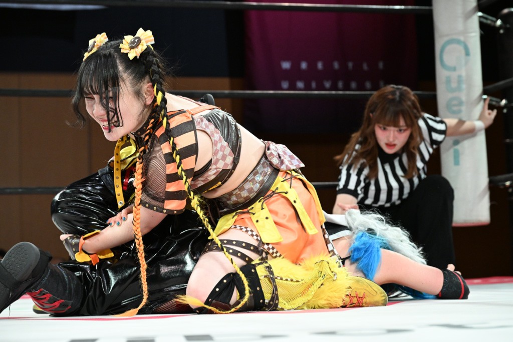 先発は山下と凍雅。ロックアップから腕を取り合う。凍雅が自コーナーに押し込むも、山下がすぐに離れて両軍スイッチ。有栖のヘッドロックに小夏がドロップキック。ここに凍雅が割って入ってボディースラムで援護し、小夏がドロップキックの連係。ボディースラムは耐えた有栖が投げ返す。かわった山下がサッカーボールキック。カウント2。有栖にかわるとロープギロチンからフライング・ボディープレス。カウント2。スイッチした山下がバックブリーカー。カウント2。フェースロックに小夏は足でロープエスケープ。ドロップキックで反撃して凍雅にスイッチ。5分経過。ランニング・エルボーはカウント2。スリーパーは山下が指を捻じ曲げて脱すると、腕にキック。両者はエルボー合戦から凍雅が追走式エルボー。これに山下がリターン・クラッシュで応戦。かわった有栖が水車落としを耐えた凍雅がフォールアウェイスラムで切り返す。かわった小夏がランニングのドロップキック連発。カウント2。スリーパーは抜けられるも、ドロップキックで追撃。再びスリーパーで捕獲。立ち上がった有栖がエルボーで脱してネックブリーカードロップ。キャメルクラッチは凍雅がカット。山下が凍雅を排除し、有栖がコーナーダイブ。避けられてしまうも、串刺しドロップキック。続く有栖の突進を小夏がコーナー反転式回転エビ固め。凍雅がエルボーでアシストし、回転エビ固め。カバーは山下のPKでカットされるも、小夏がこなつくらっしゅ。10分経過。カウント2でキックアウトした有栖が水車落としと山下がアティテュード・アジャストメントで共演。続く什の掟狙いを小夏に耐えられると、有栖はスーパーキックでダメージを与え、什の掟につないで勝利。