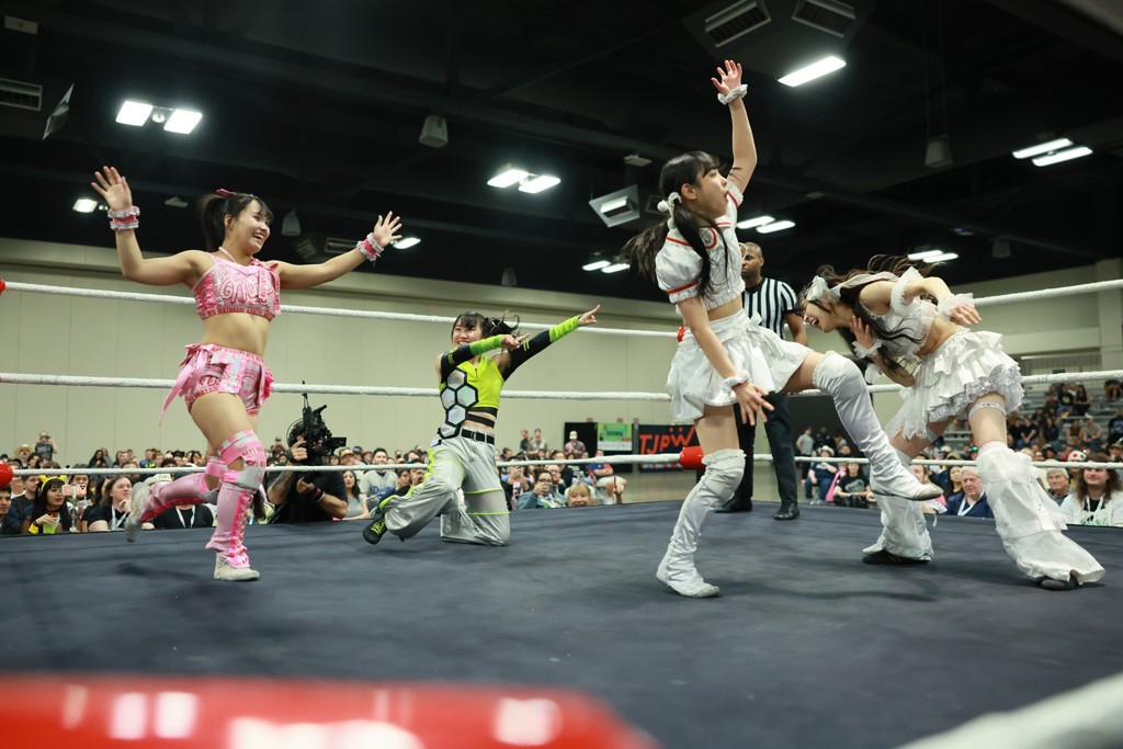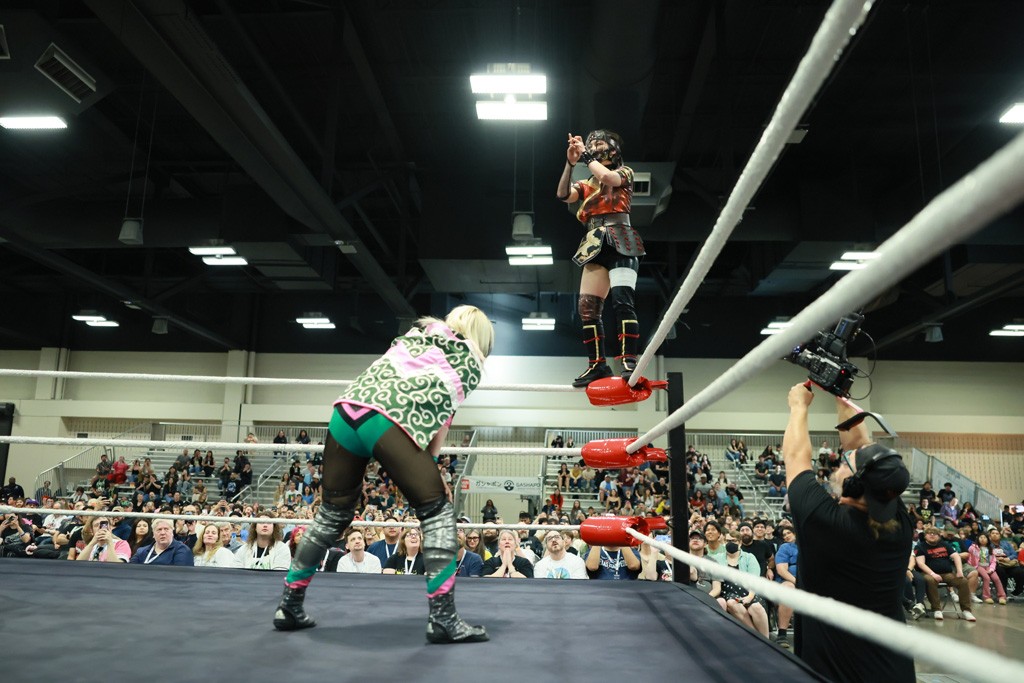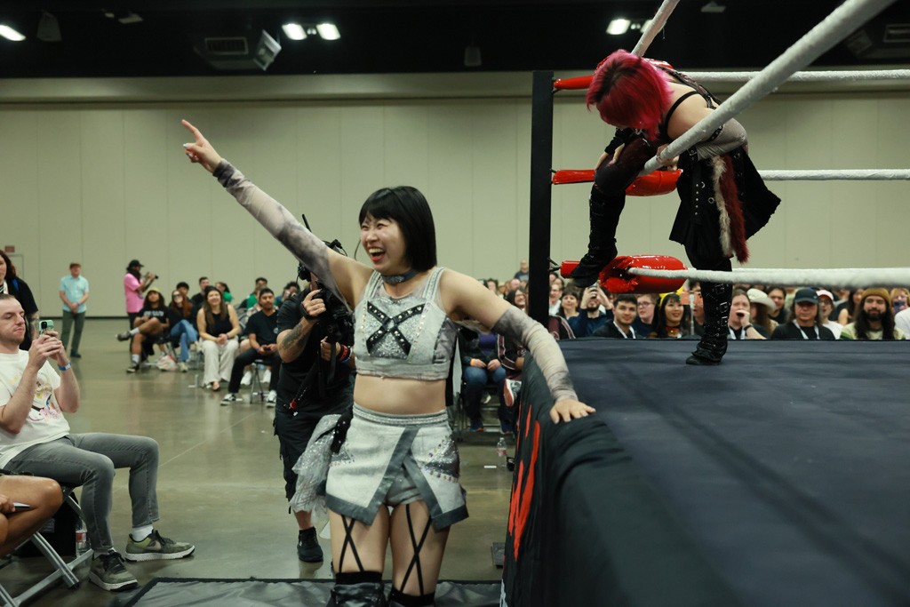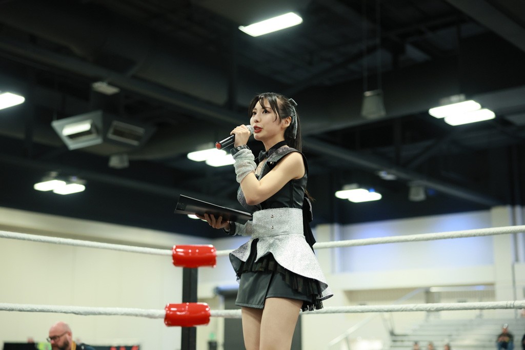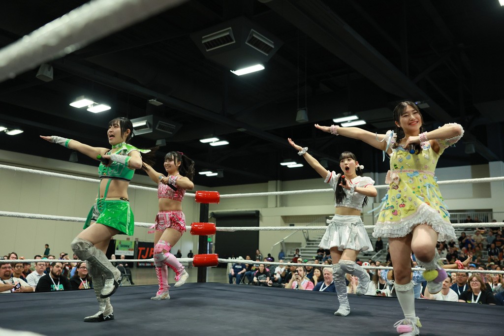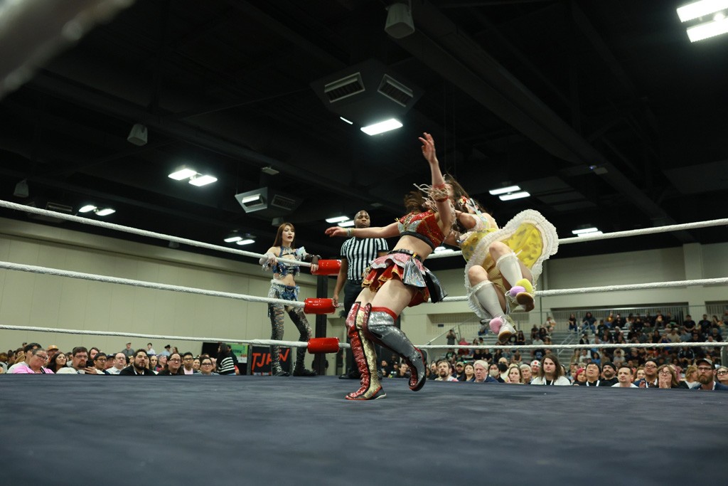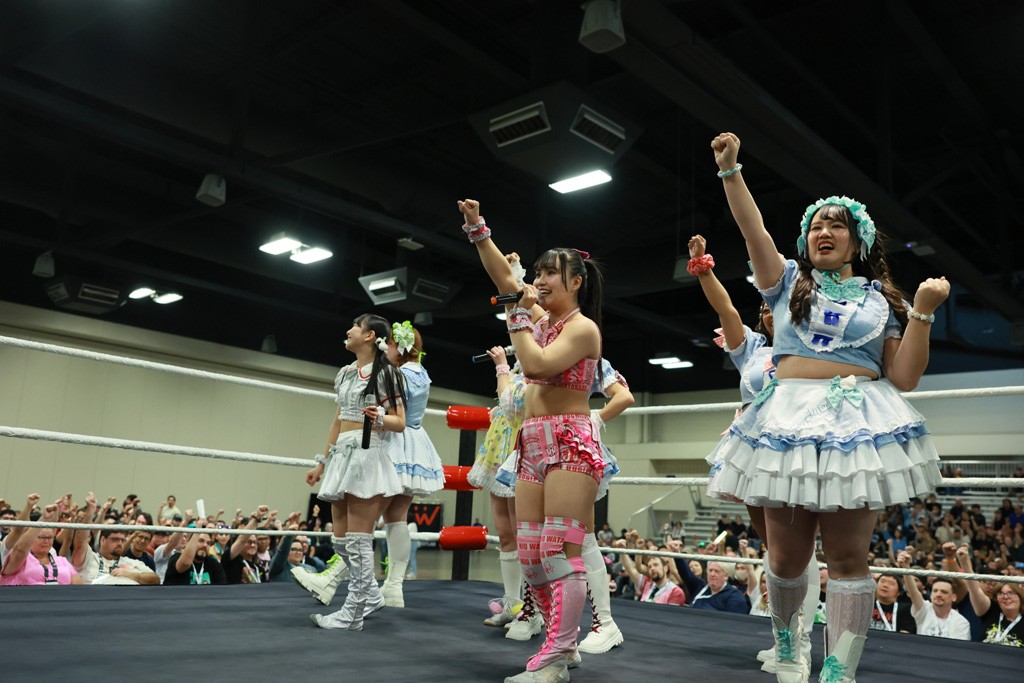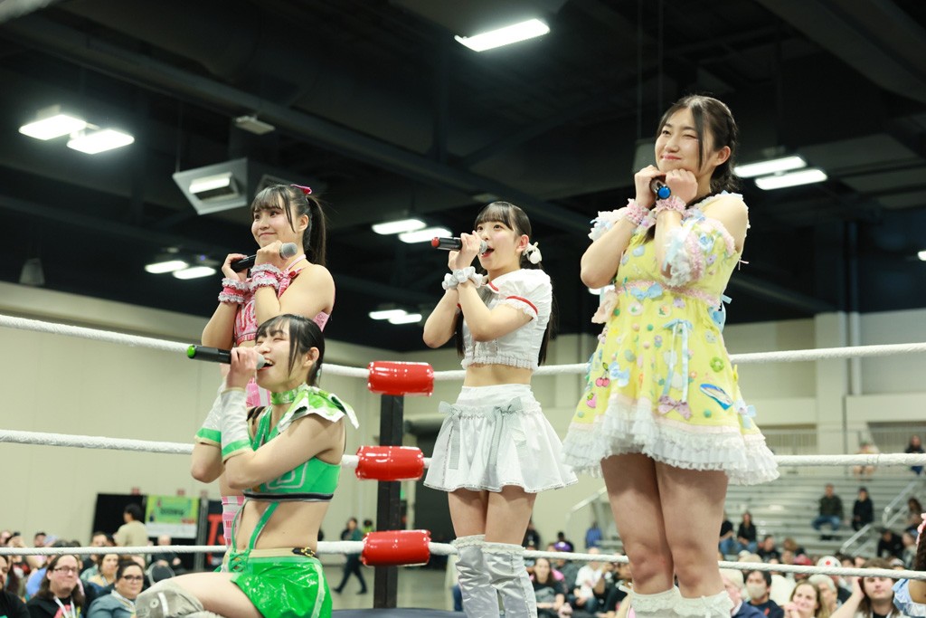 難波小百合リングアナがアップアップガールズ(プロレス)を呼び込み、英語と日本語でそれぞれ自己紹介。『カワツヨチャレンジャー』を熱唱し、地元アイドルのMegami Maids(メグミメイドズ)とともに「東京女子プロレス、スタート!」でオースティン大会2日目が幕を開けた。