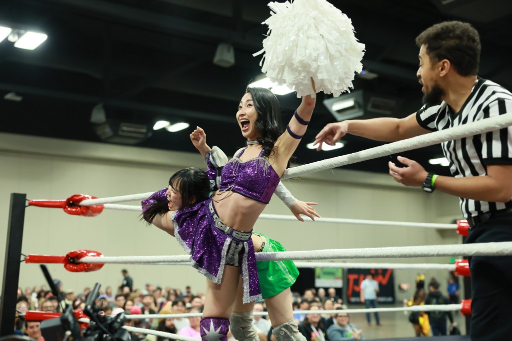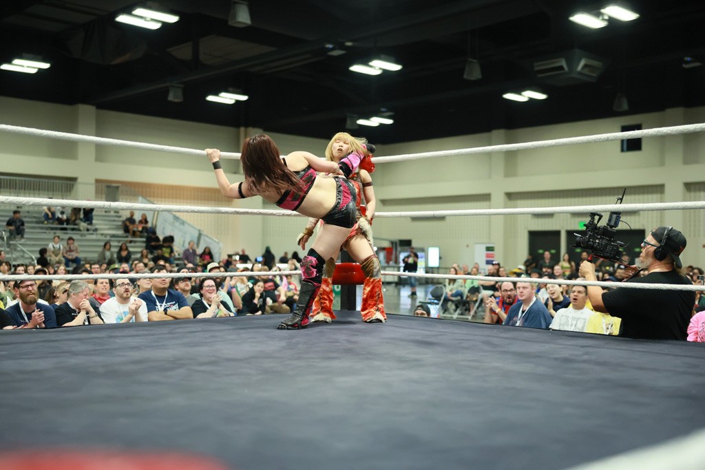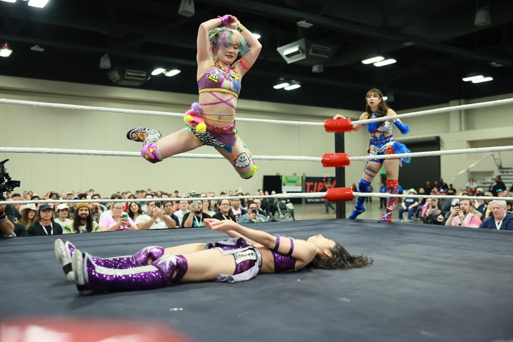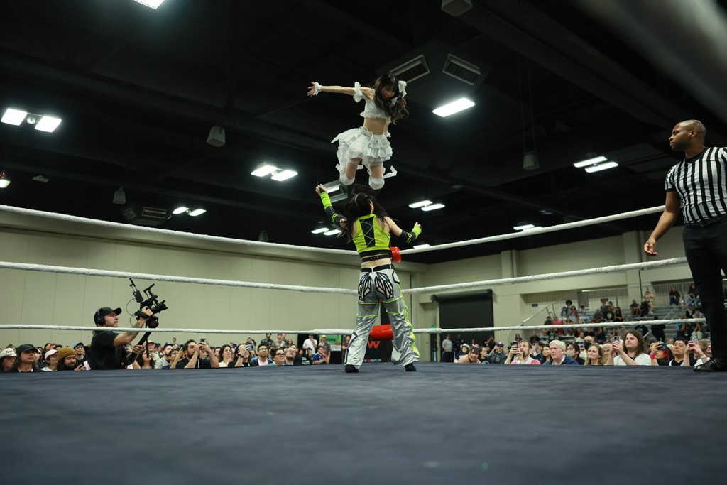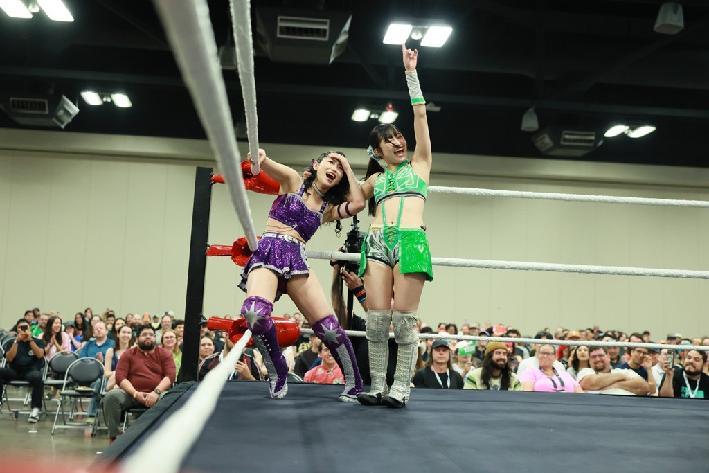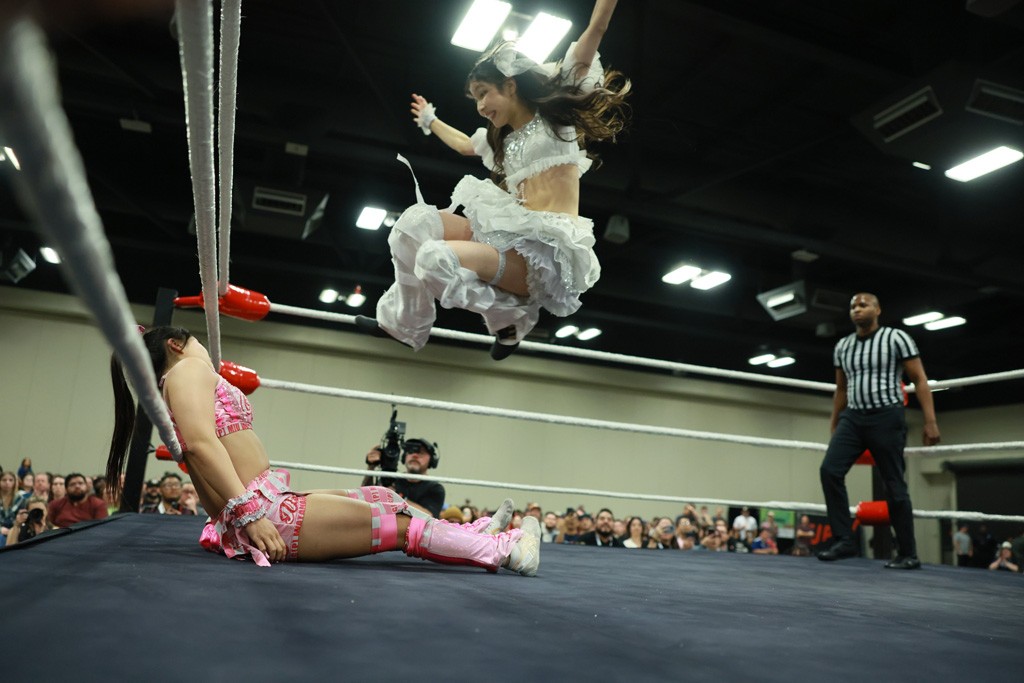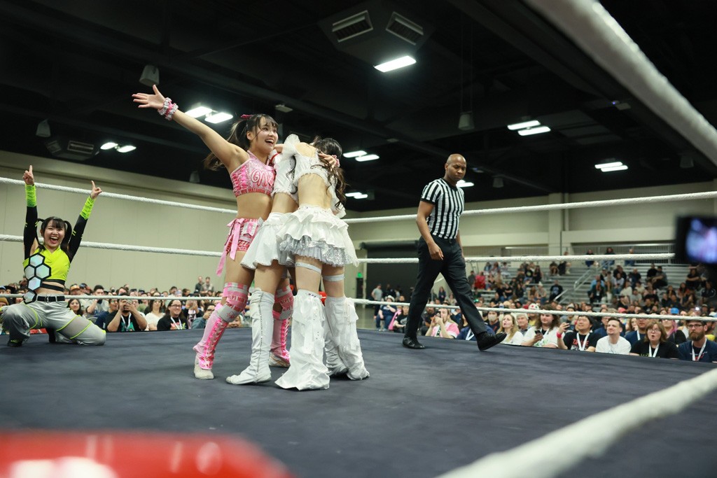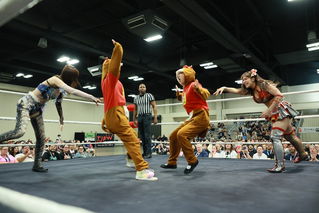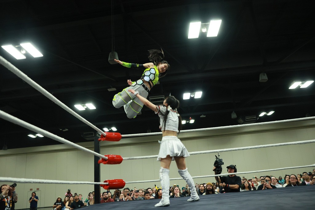 難波小百合リングアナがアップアップガールズ(プロレス)を呼び込み、英語と日本語でそれぞれ自己紹介。『カワツヨチャレンジャー』を熱唱し、地元アイドルのMegami Maids(メグミメイドズ)とともに「東京女子プロレス、スタート!」でオースティン大会2日目が幕を開けた。