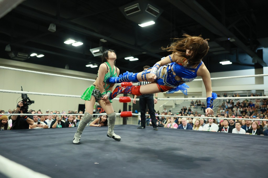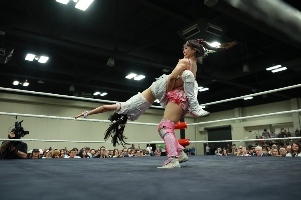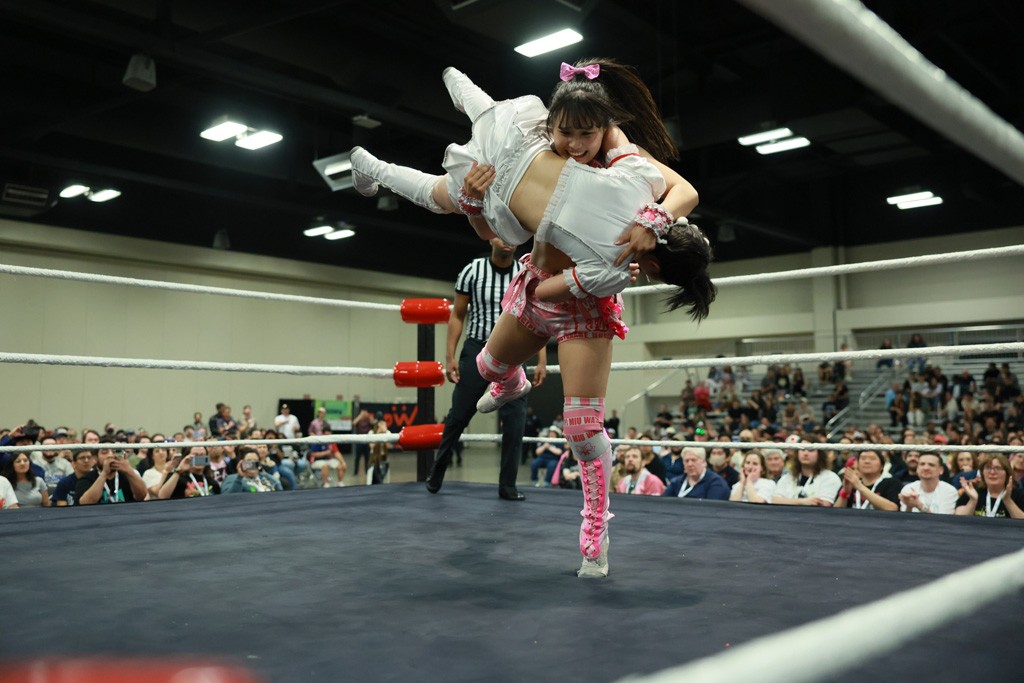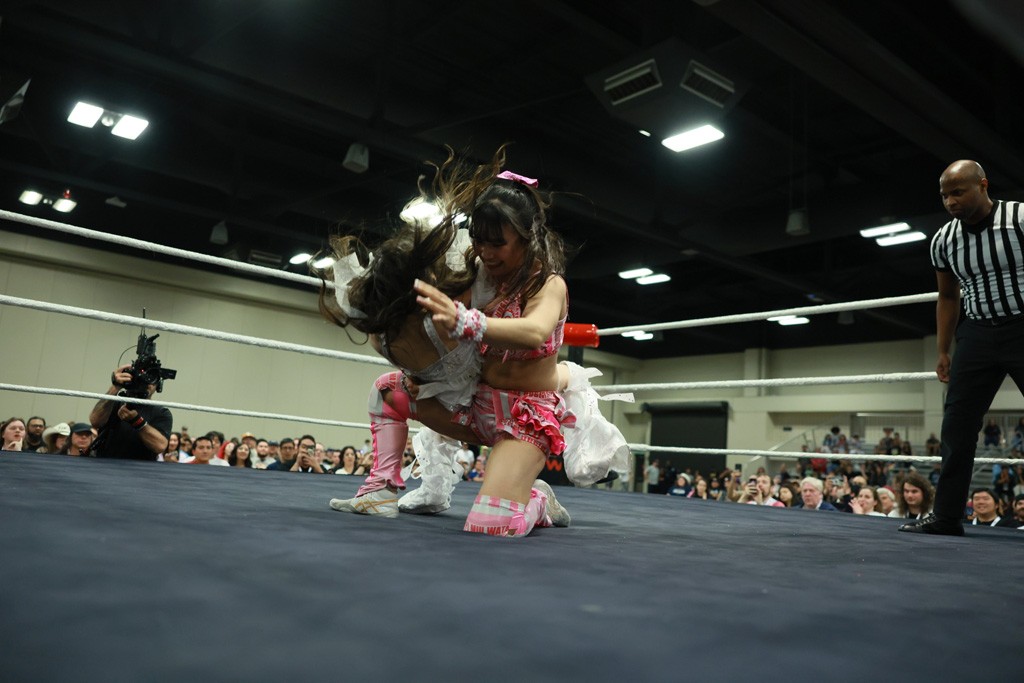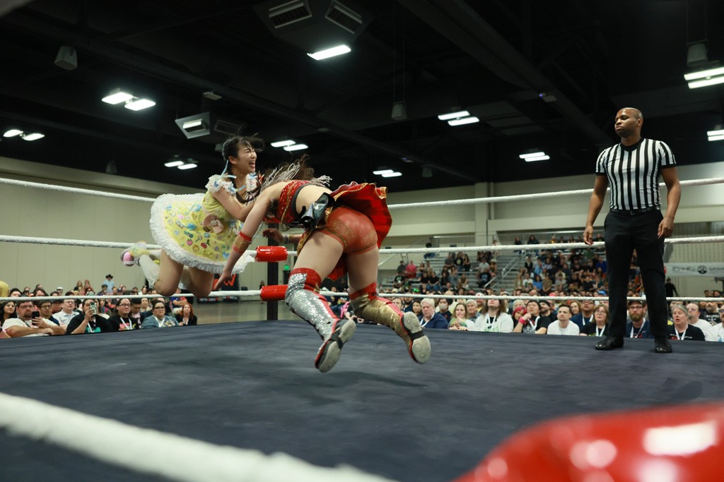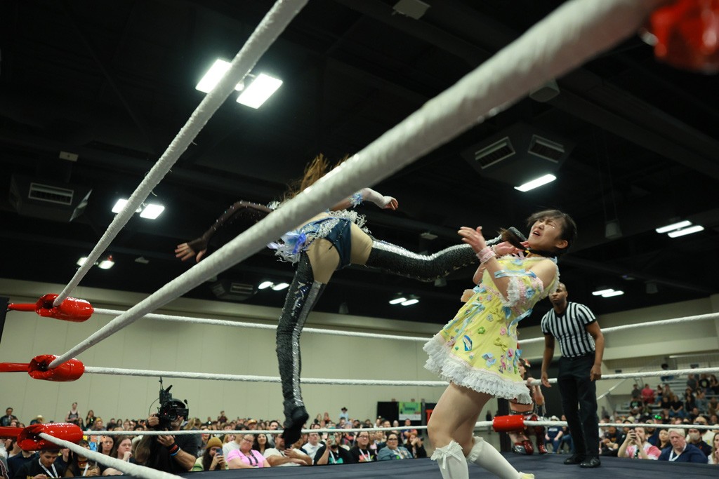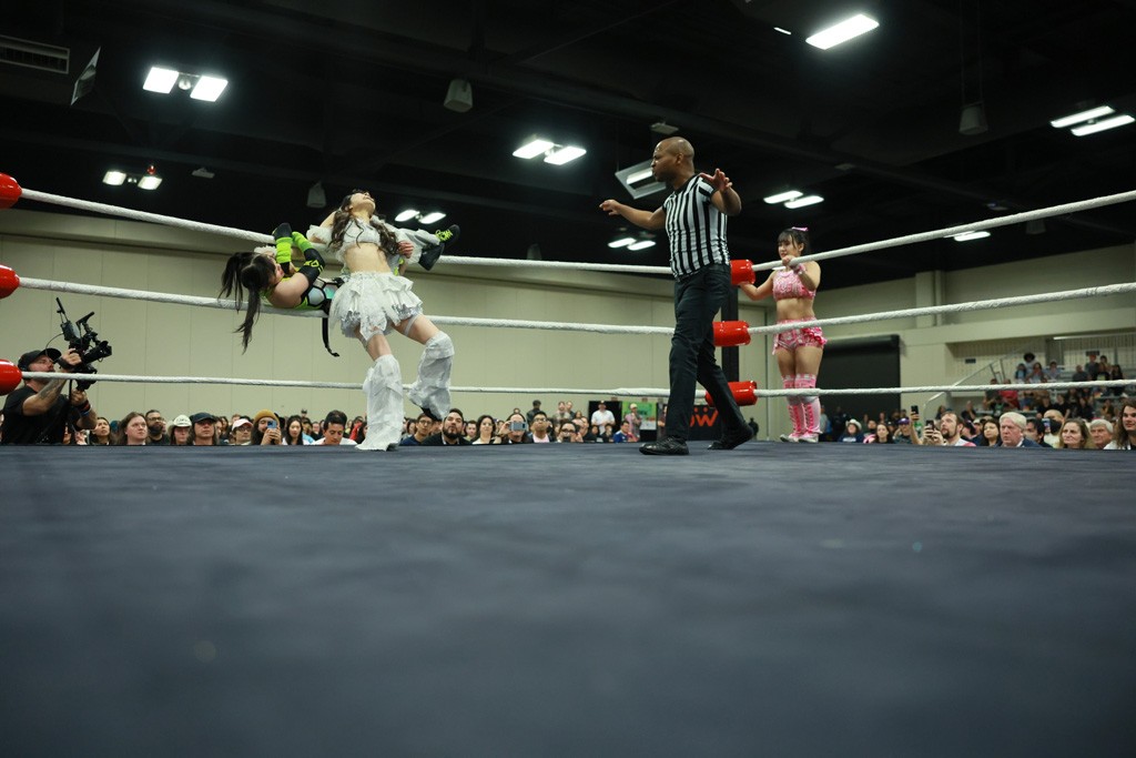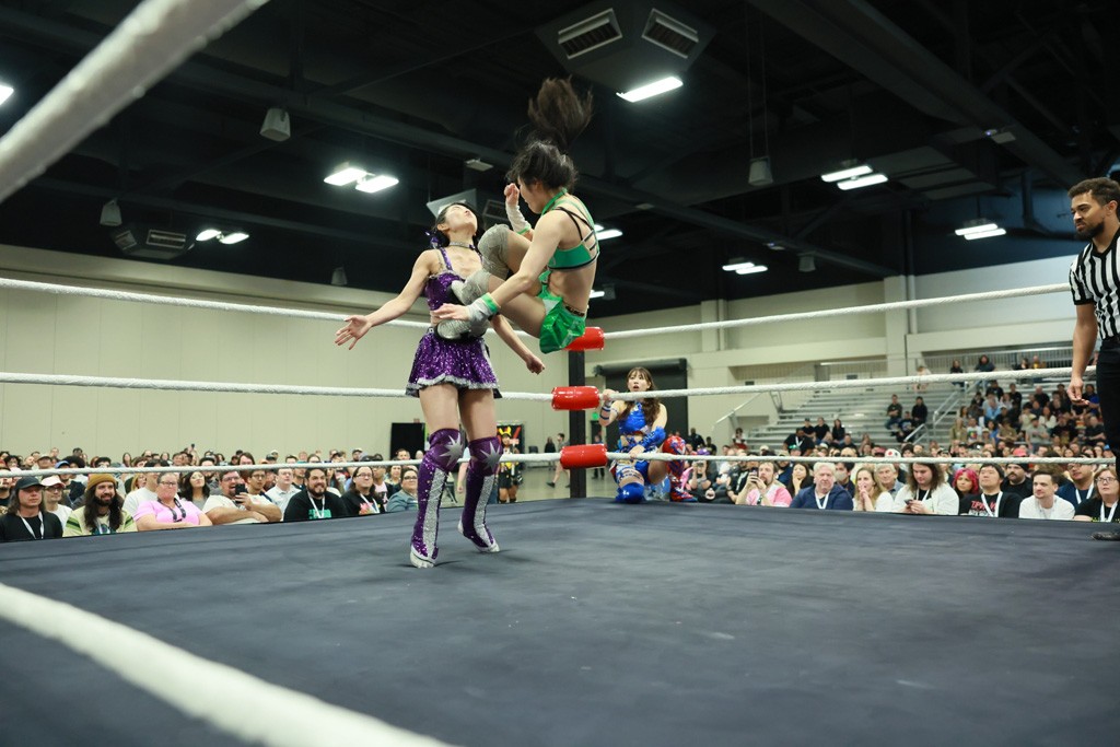 難波小百合リングアナがアップアップガールズ(プロレス)を呼び込み、英語と日本語でそれぞれ自己紹介。『カワツヨチャレンジャー』を熱唱し、地元アイドルのMegami Maids(メグミメイドズ)とともに「東京女子プロレス、スタート!」でオースティン大会2日目が幕を開けた。