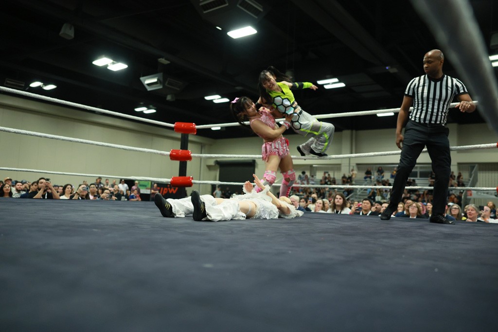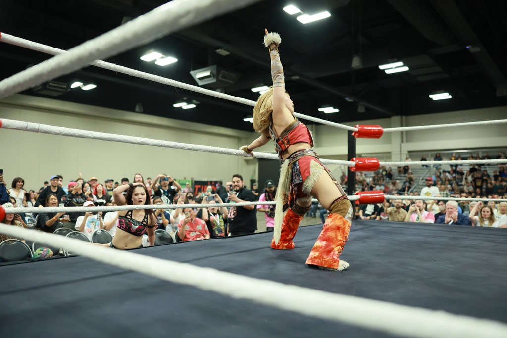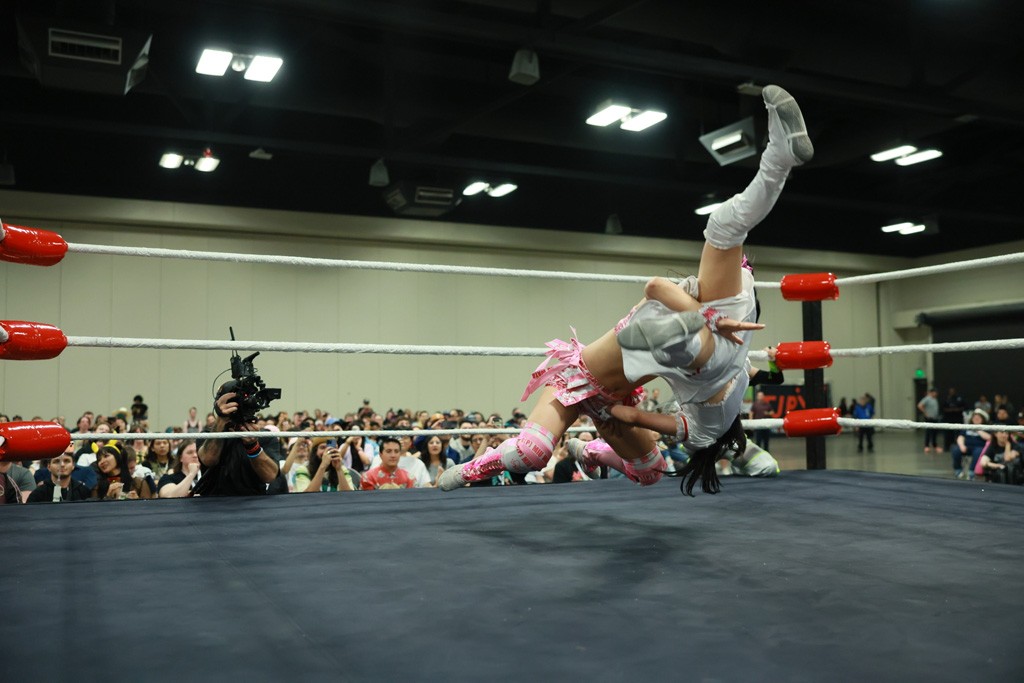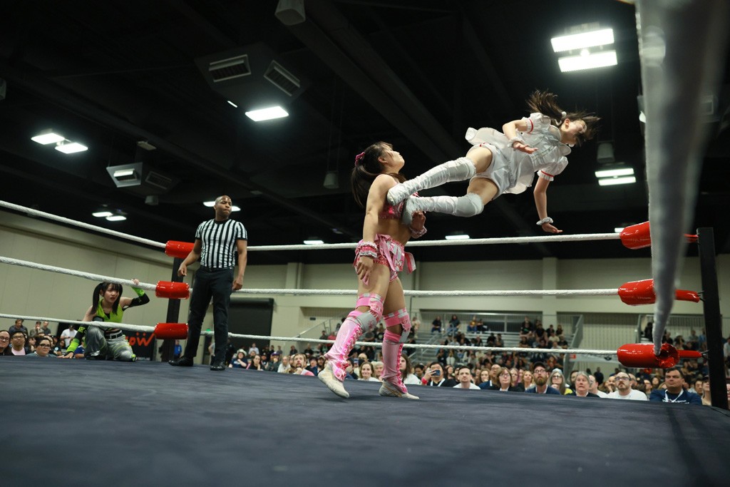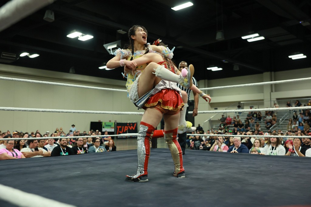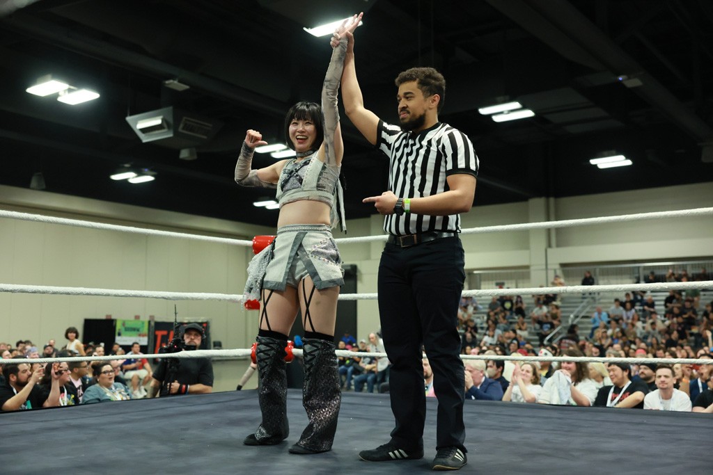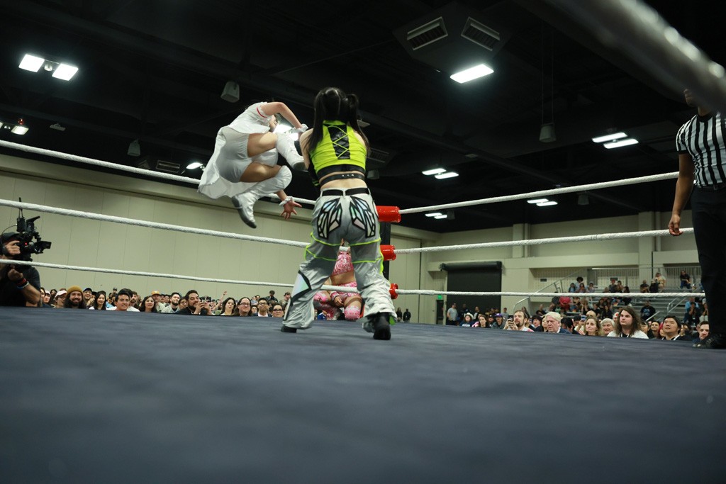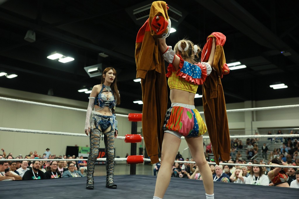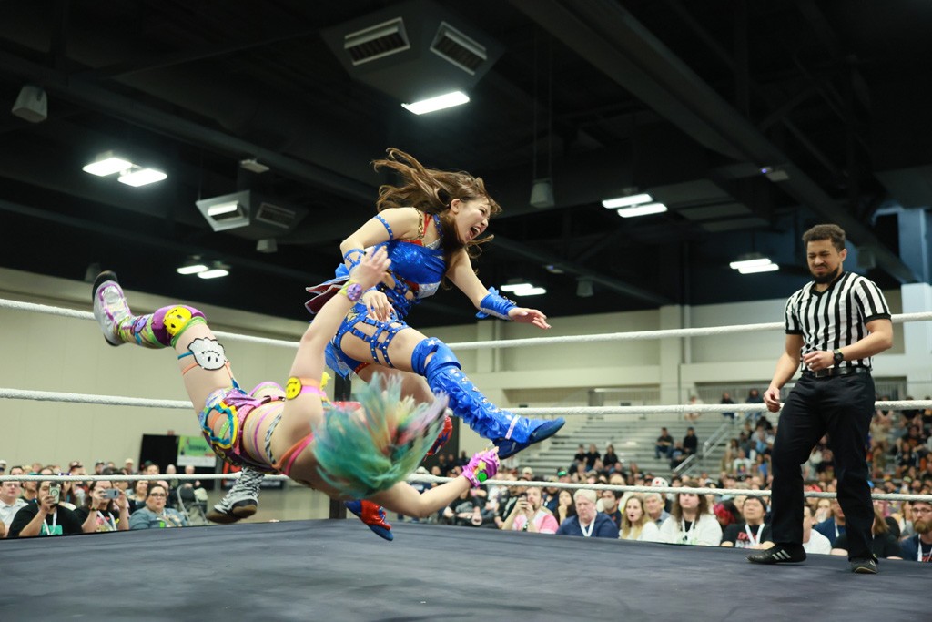 難波小百合リングアナがアップアップガールズ(プロレス)を呼び込み、英語と日本語でそれぞれ自己紹介。『カワツヨチャレンジャー』を熱唱し、地元アイドルのMegami Maids(メグミメイドズ)とともに「東京女子プロレス、スタート!」でオースティン大会2日目が幕を開けた。