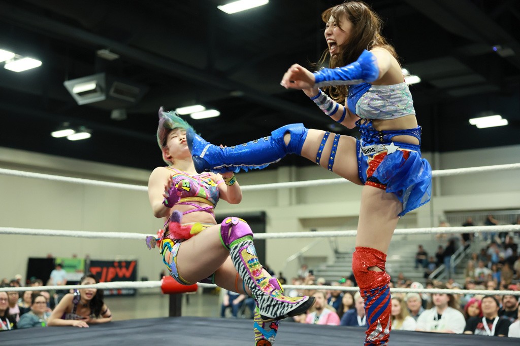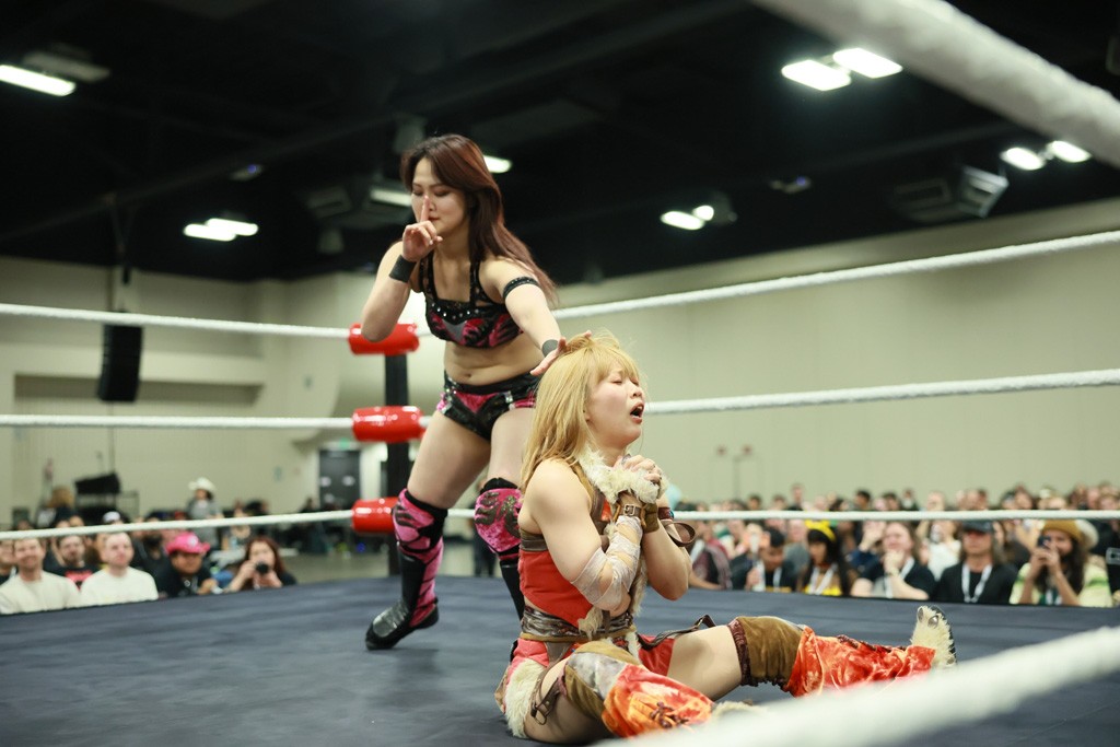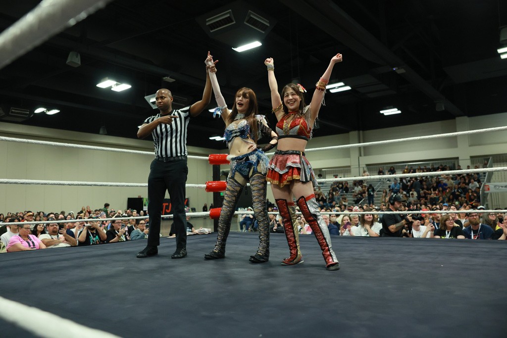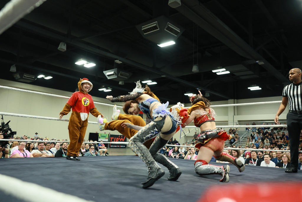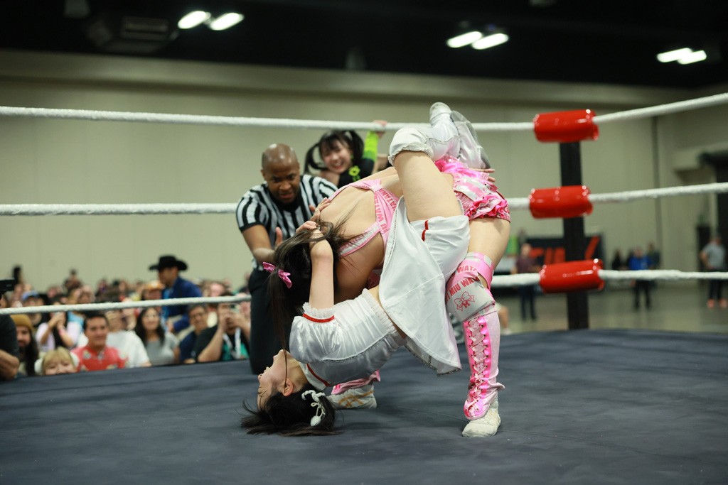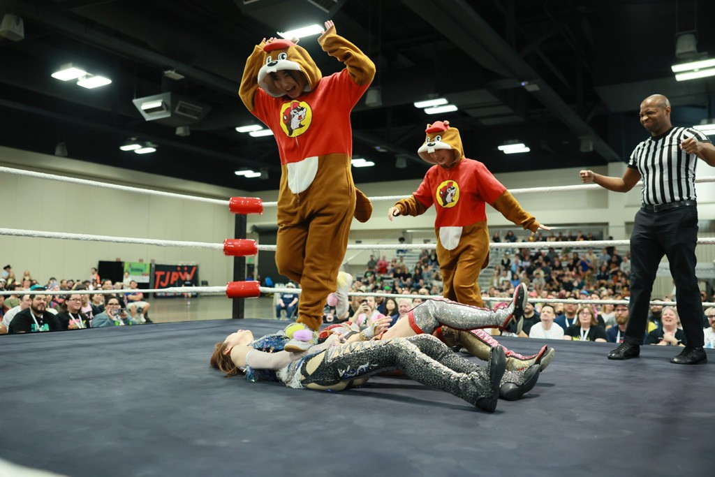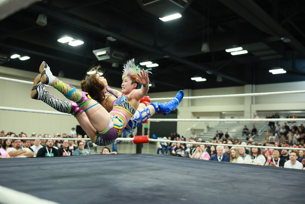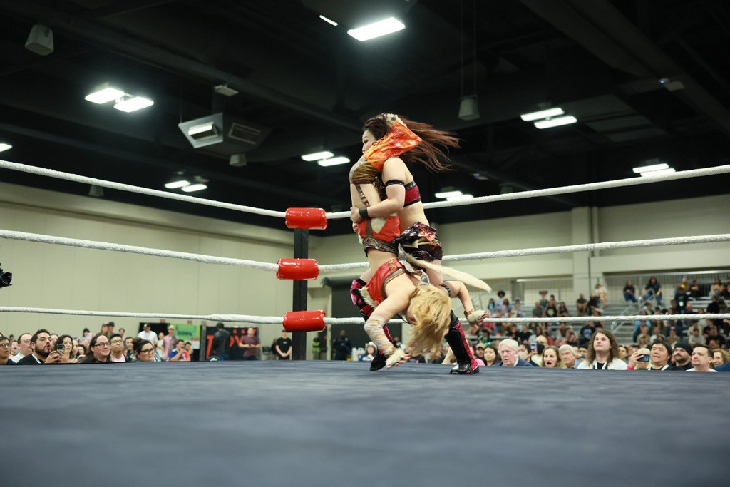 難波小百合リングアナがアップアップガールズ(プロレス)を呼び込み、英語と日本語でそれぞれ自己紹介。『カワツヨチャレンジャー』を熱唱し、地元アイドルのMegami Maids(メグミメイドズ)とともに「東京女子プロレス、スタート!」でオースティン大会2日目が幕を開けた。