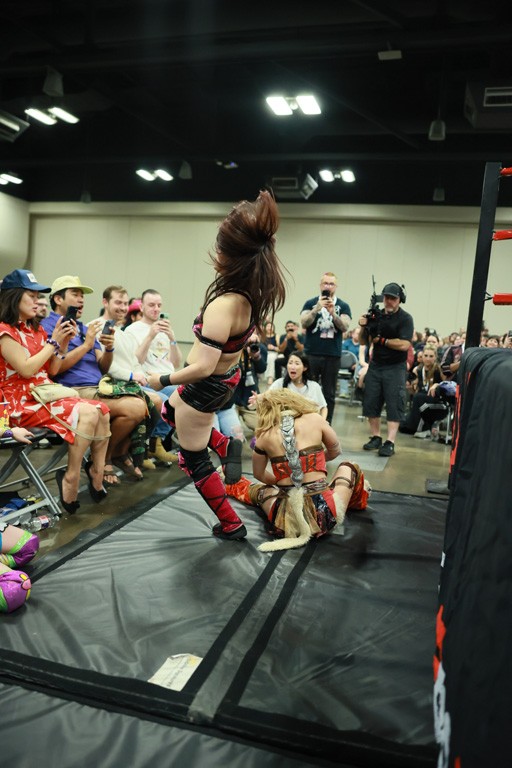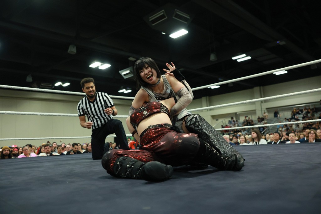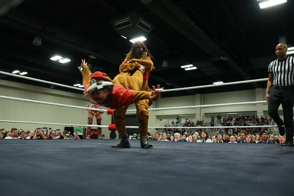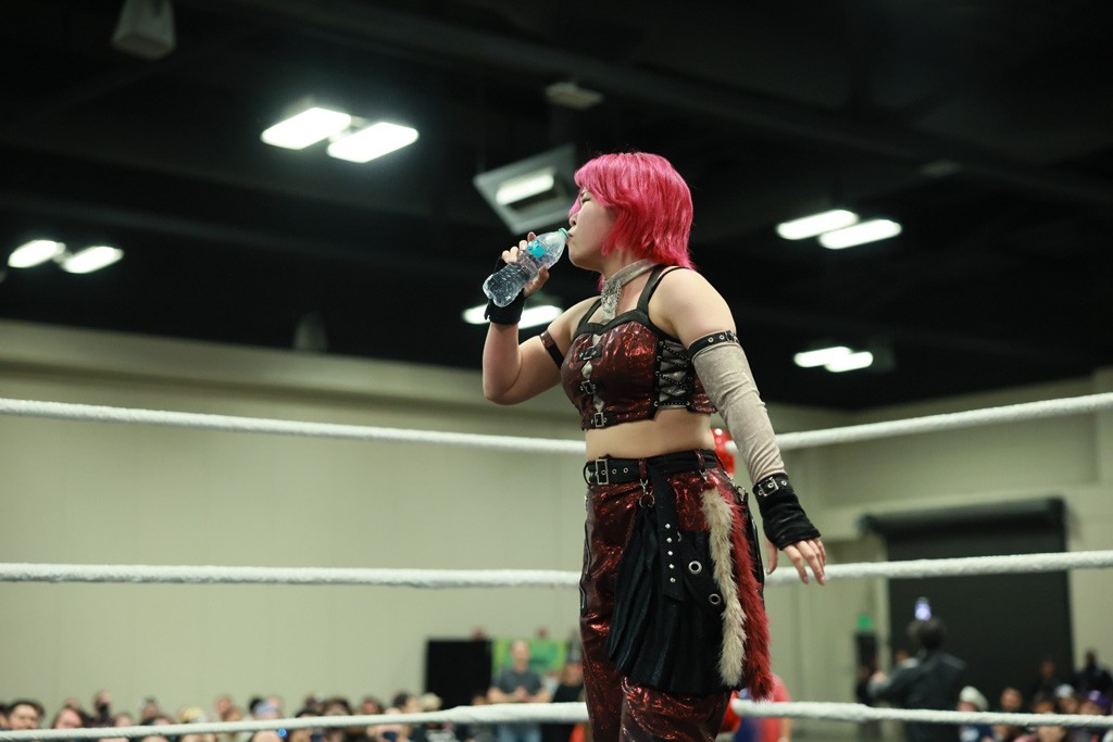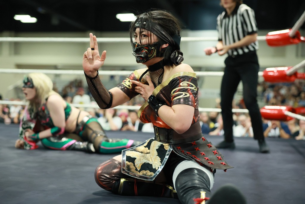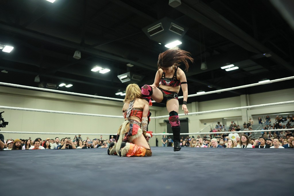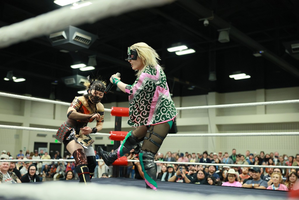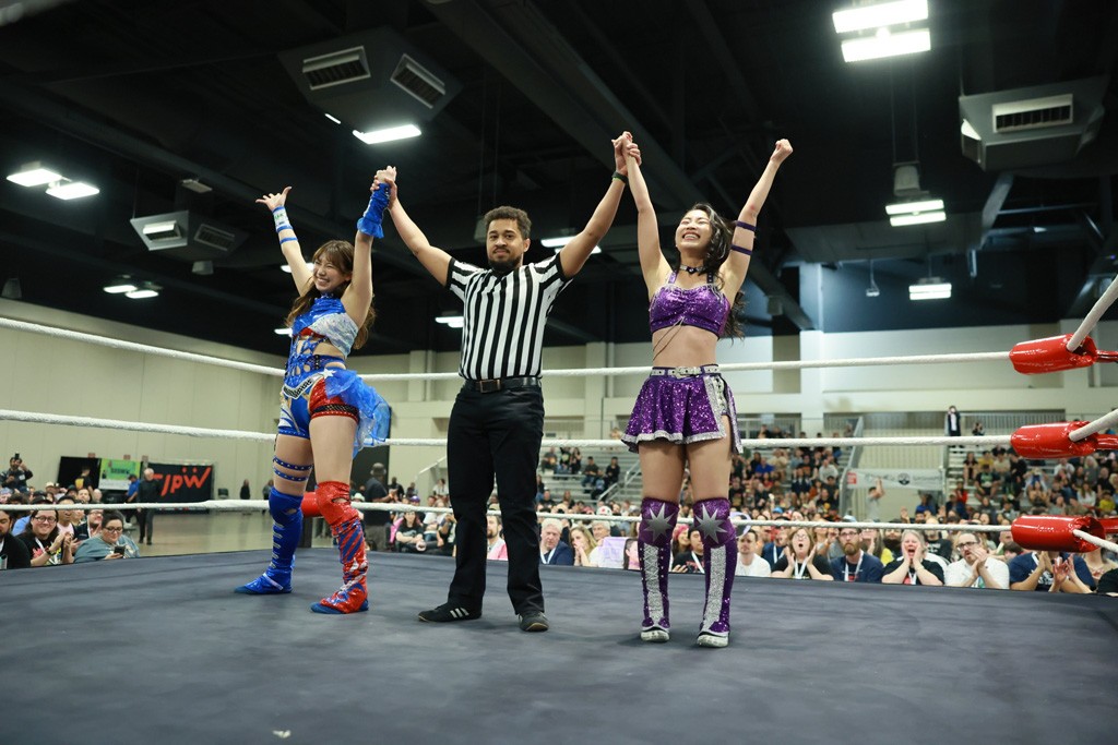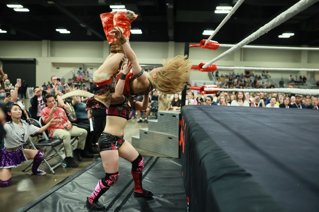 難波小百合リングアナがアップアップガールズ(プロレス)を呼び込み、英語と日本語でそれぞれ自己紹介。『カワツヨチャレンジャー』を熱唱し、地元アイドルのMegami Maids(メグミメイドズ)とともに「東京女子プロレス、スタート!」でオースティン大会2日目が幕を開けた。