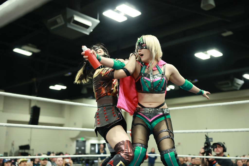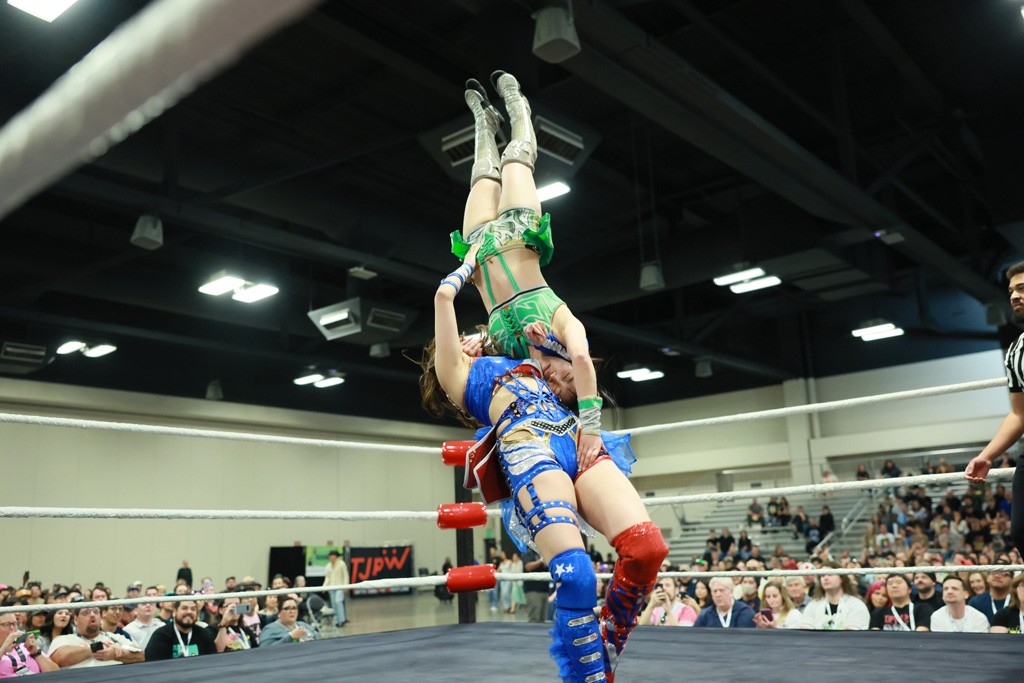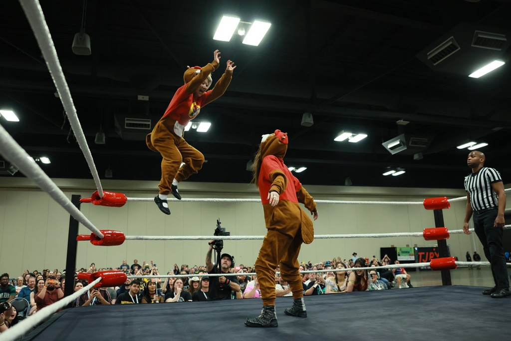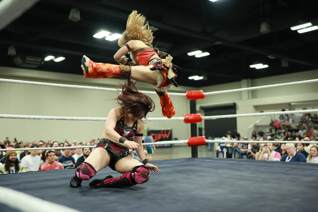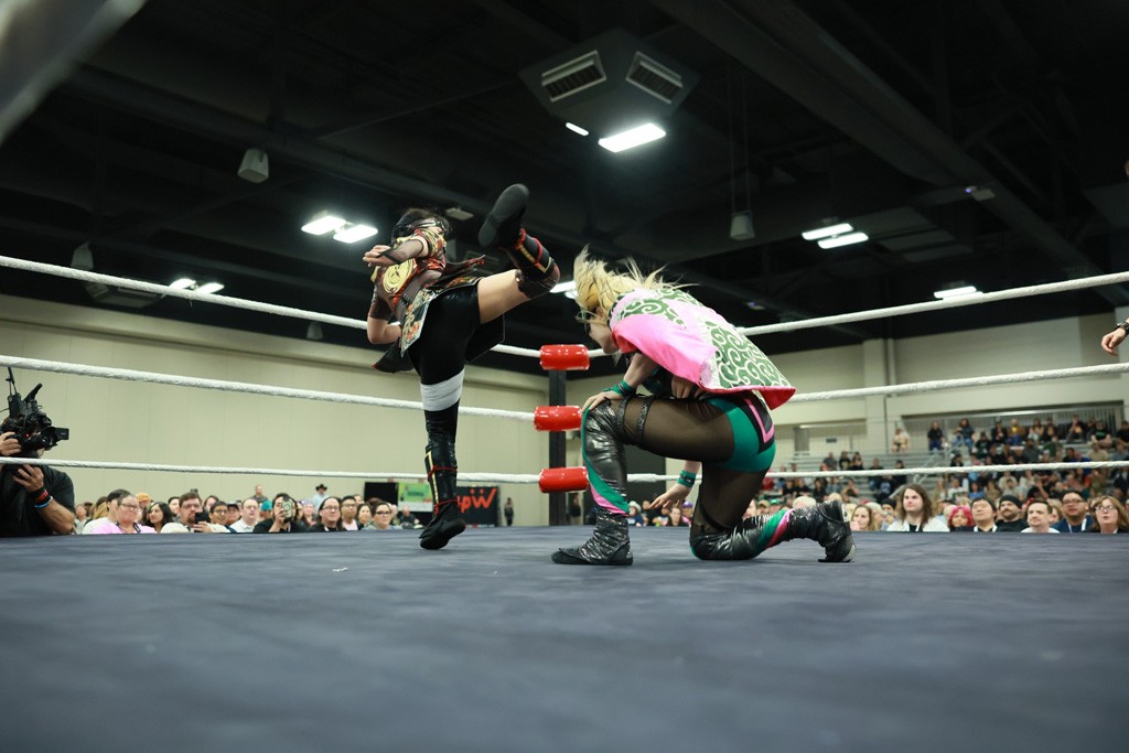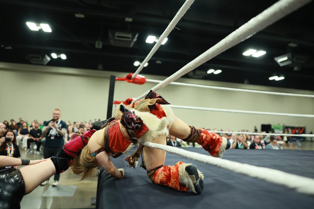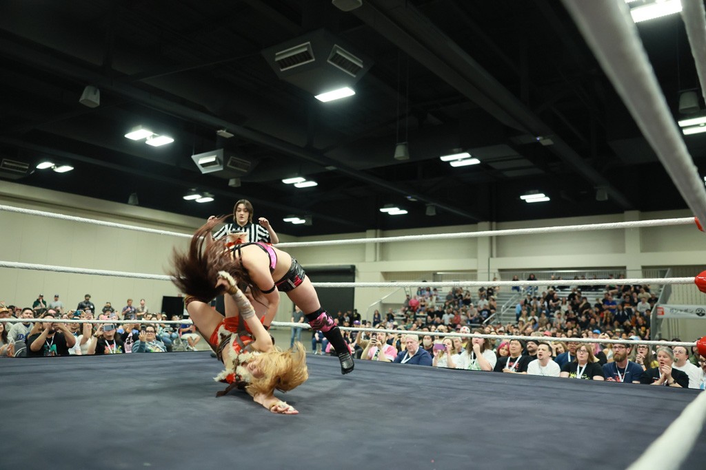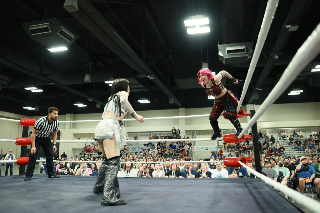 難波小百合リングアナがアップアップガールズ(プロレス)を呼び込み、英語と日本語でそれぞれ自己紹介。『カワツヨチャレンジャー』を熱唱し、地元アイドルのMegami Maids(メグミメイドズ)とともに「東京女子プロレス、スタート!」でオースティン大会2日目が幕を開けた。