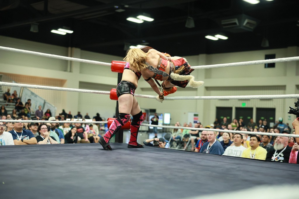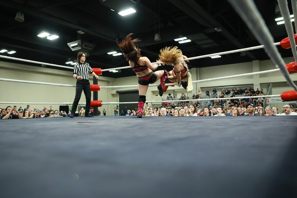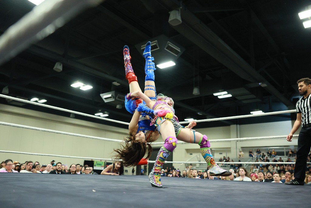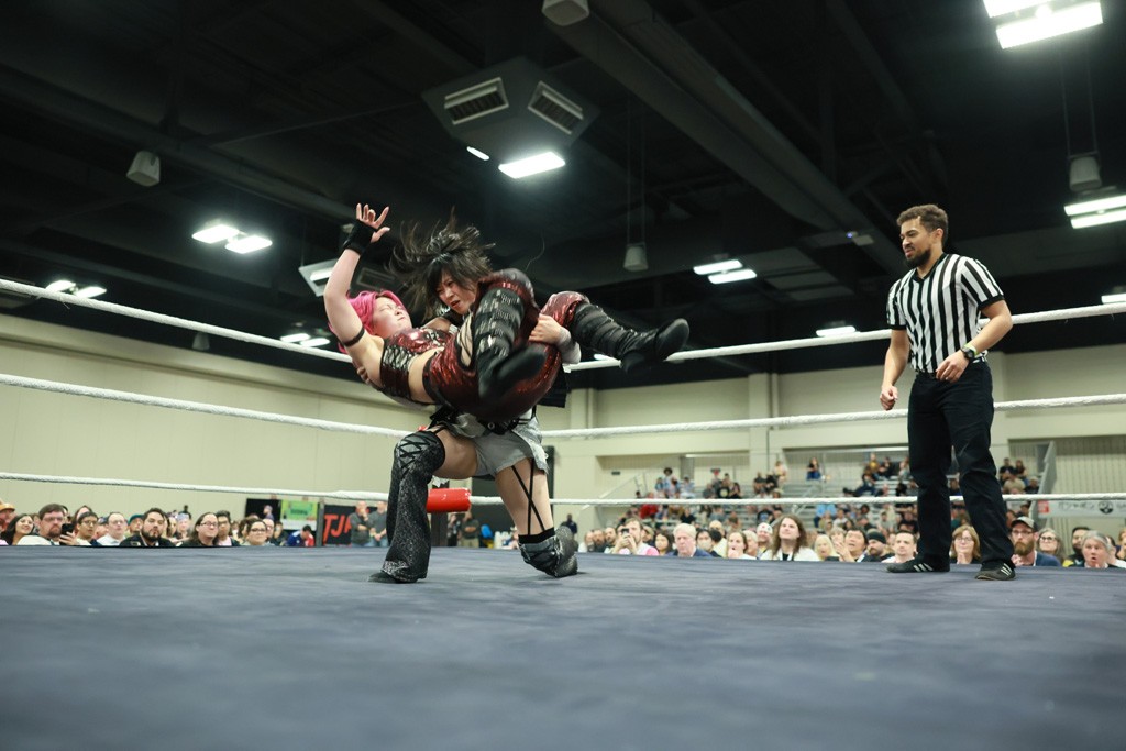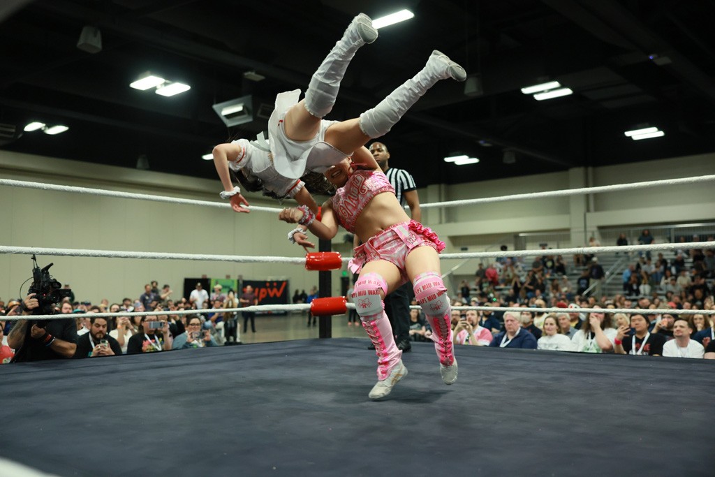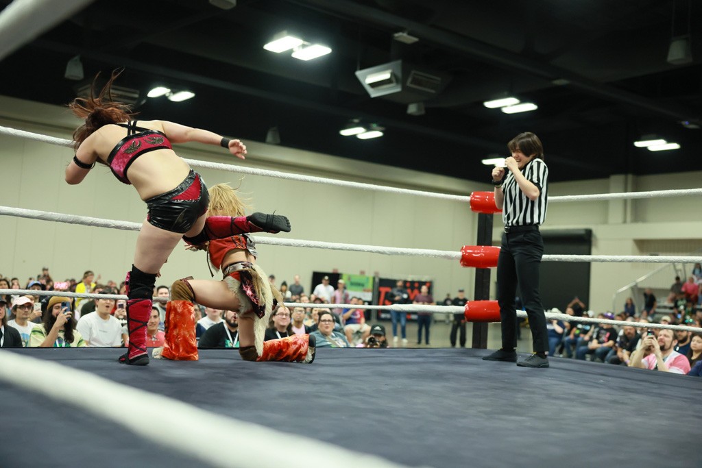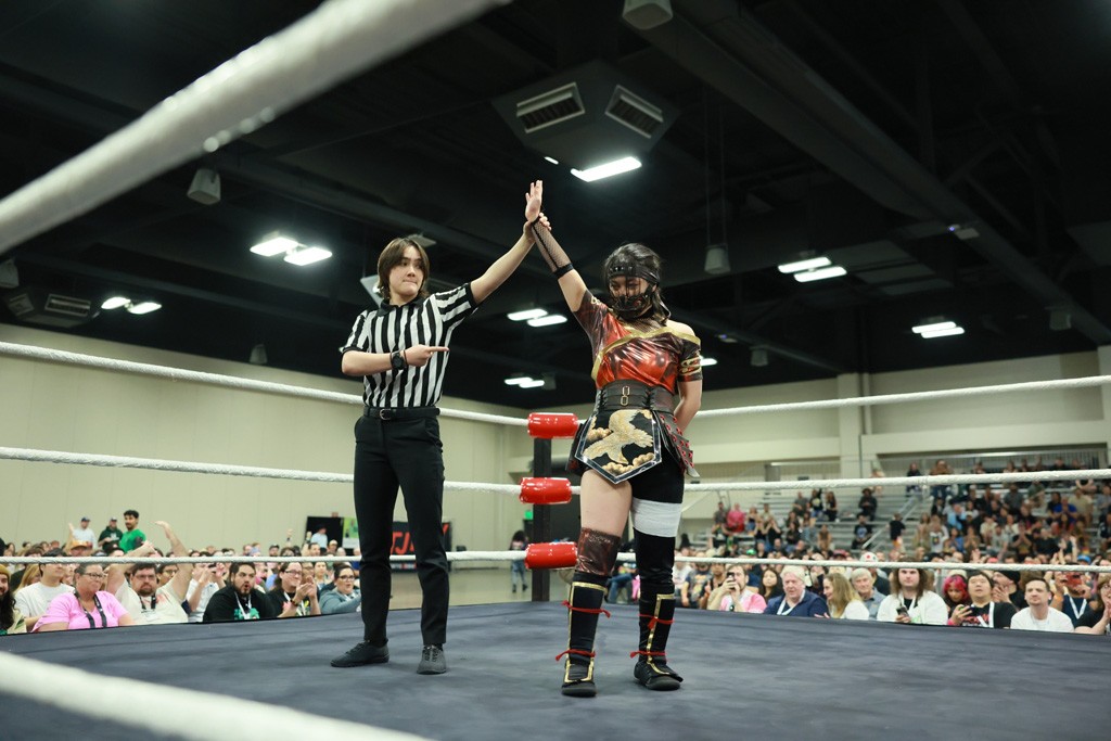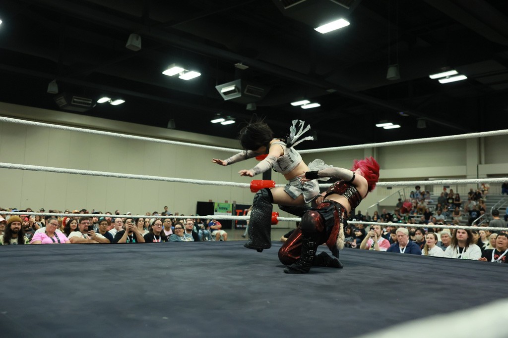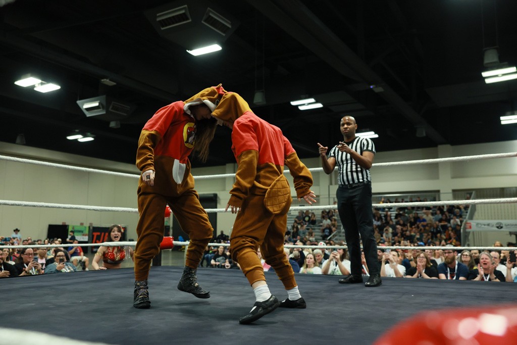 難波小百合リングアナがアップアップガールズ(プロレス)を呼び込み、英語と日本語でそれぞれ自己紹介。『カワツヨチャレンジャー』を熱唱し、地元アイドルのMegami Maids(メグミメイドズ)とともに「東京女子プロレス、スタート!」でオースティン大会2日目が幕を開けた。