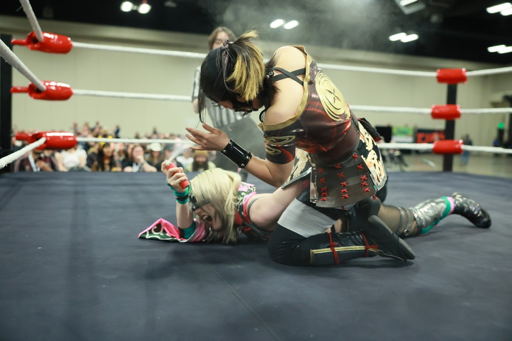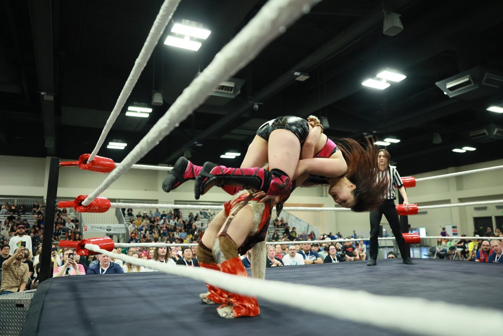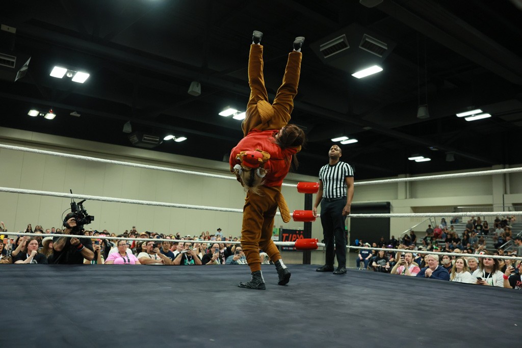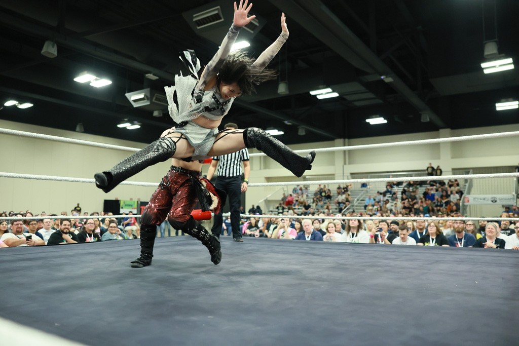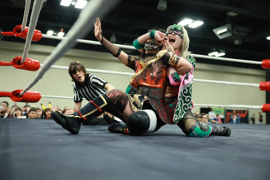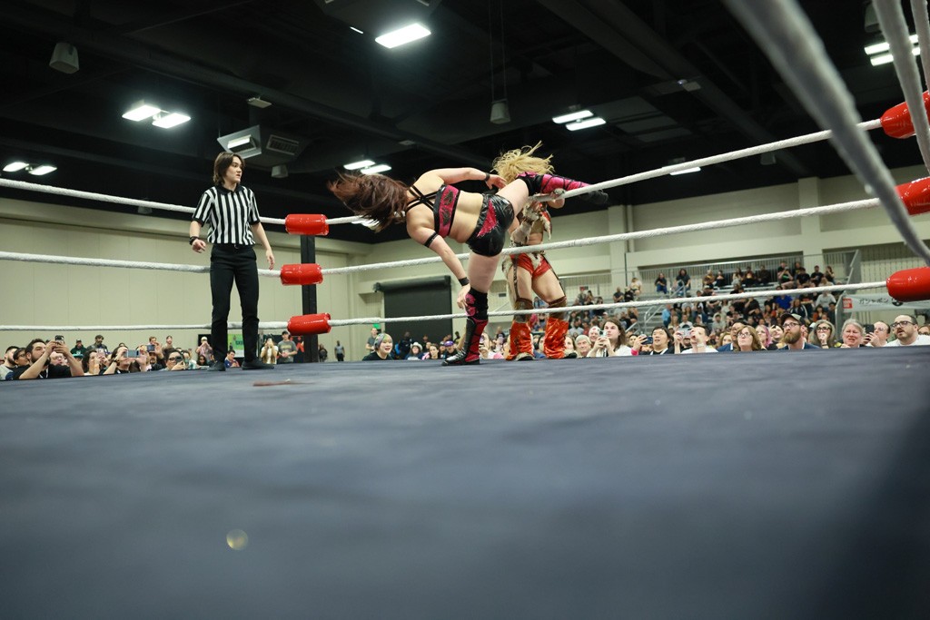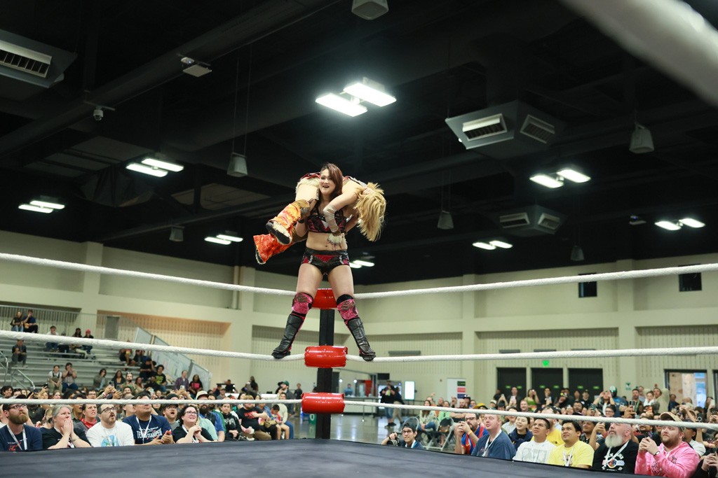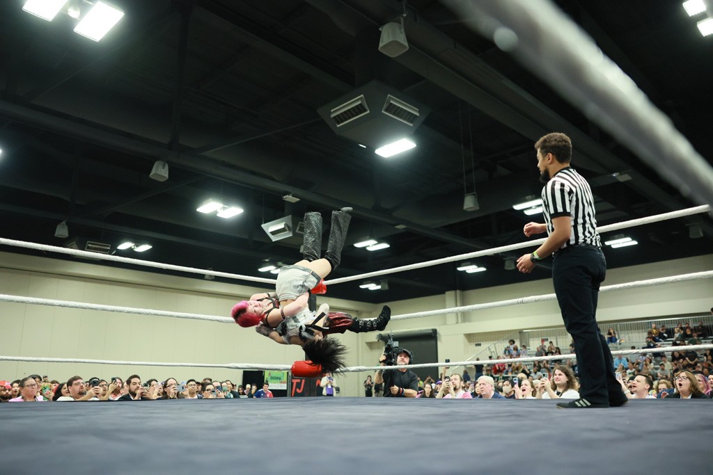 難波小百合リングアナがアップアップガールズ(プロレス)を呼び込み、英語と日本語でそれぞれ自己紹介。『カワツヨチャレンジャー』を熱唱し、地元アイドルのMegami Maids(メグミメイドズ)とともに「東京女子プロレス、スタート!」でオースティン大会2日目が幕を開けた。