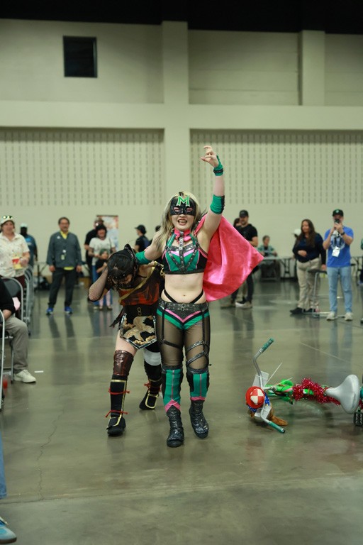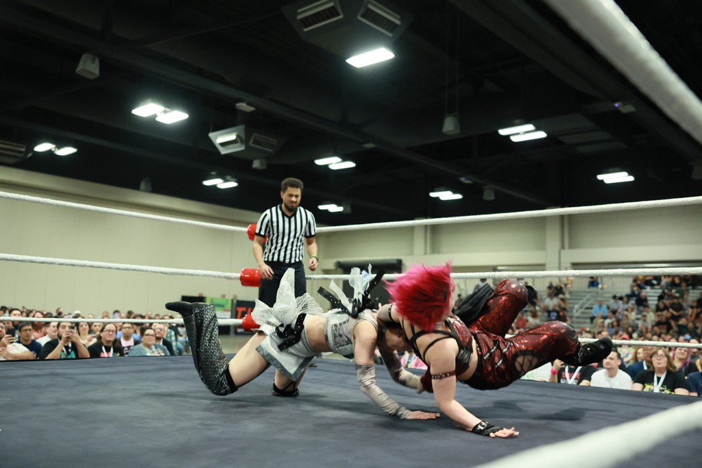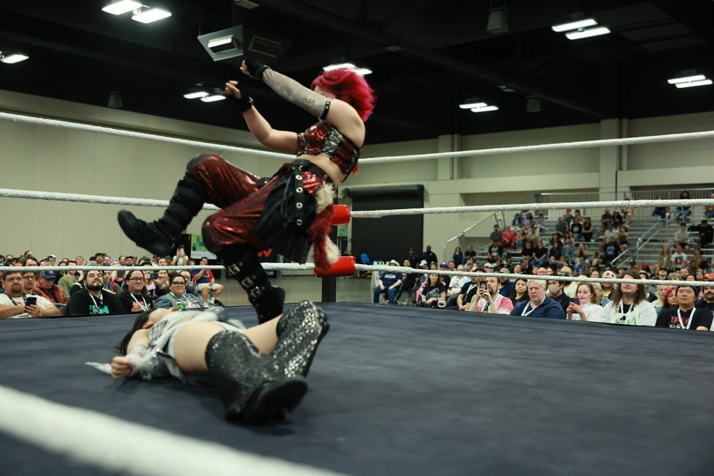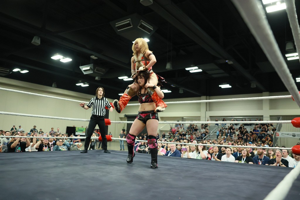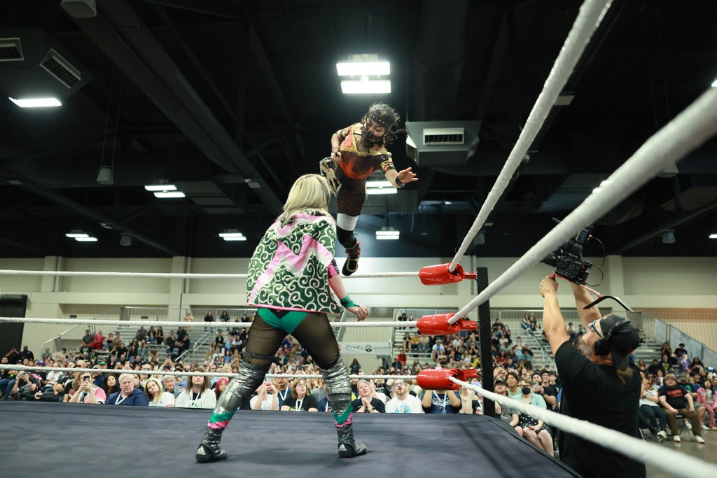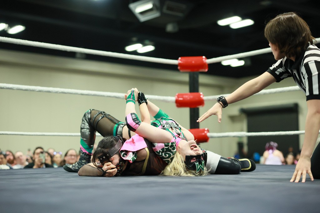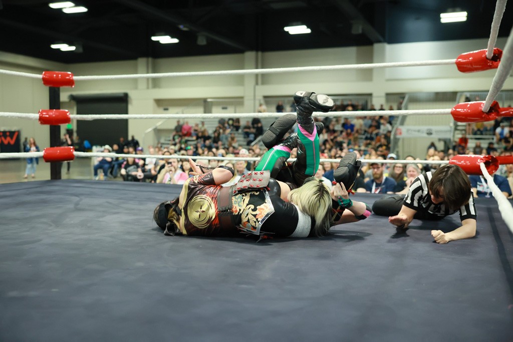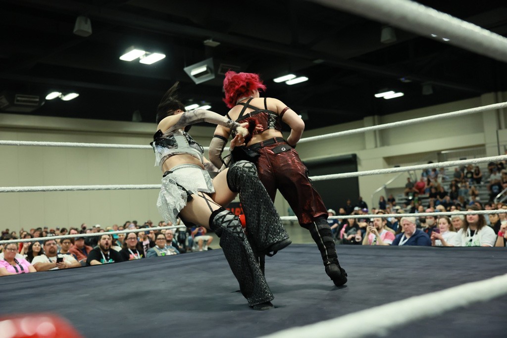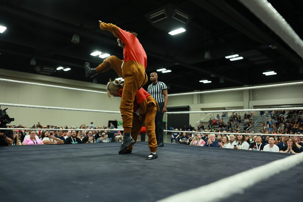 難波小百合リングアナがアップアップガールズ(プロレス)を呼び込み、英語と日本語でそれぞれ自己紹介。『カワツヨチャレンジャー』を熱唱し、地元アイドルのMegami Maids(メグミメイドズ)とともに「東京女子プロレス、スタート!」でオースティン大会2日目が幕を開けた。