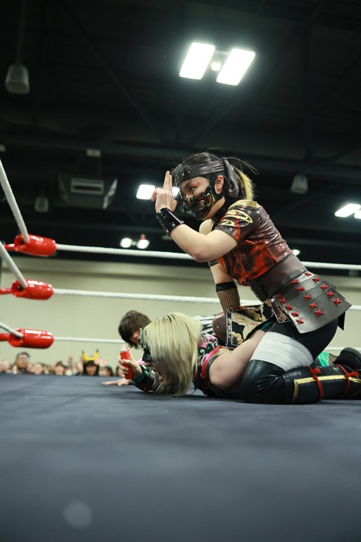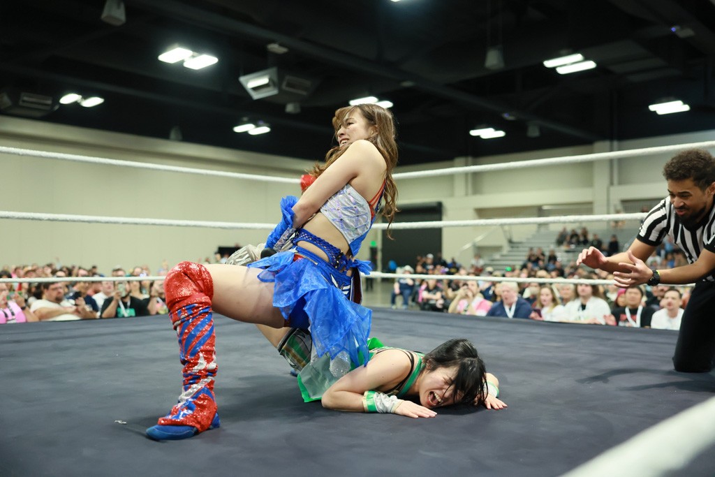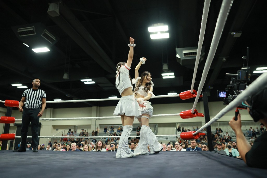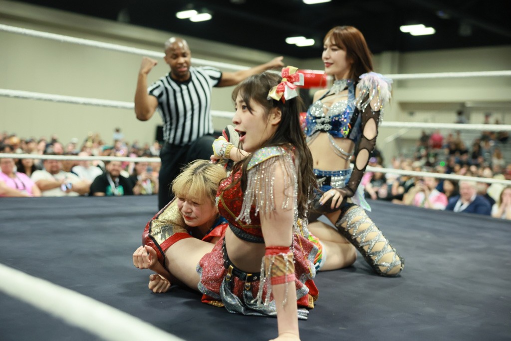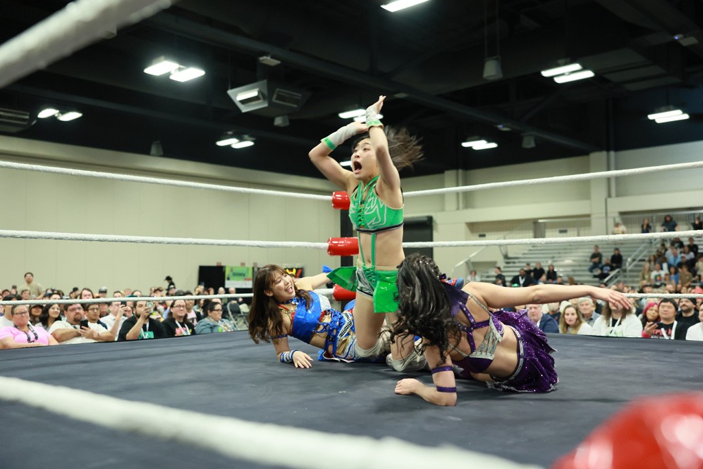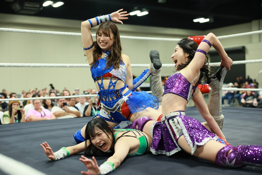 瑞希と汐珠はお互いに白のコスチュームで登場。瑞希&汐珠が握手からのトーキックの奇襲は防御されるも、コルバタとハリケーンラナで共演。汐珠がコーナーから場外弾。瑞希のハンマースルーで汐珠が串刺しエルボーを放っていくが、2人がハンマースルーで揉め出すと、未詩が2人まとめて滞空式ボディースラムに場内大歓声。カウント2。スイッチした鈴芽のレッグロックは汐珠がロープエスケープ。かわった未詩がボディースラム。カウント2。さらにもう1発を放ってかわった鈴芽がミカヅキ流星群。これは瑞希がカット。汐珠が丸め込んでドロップキックを決めると瑞希にスイッチ。コーナーの未詩を排除し、ダイビング・クロスボディ。カウント2。ロープ越しでのハチノス・ノットエイトに捕まった瑞希だったが、ドロップキックをかわしてフットスタンプを背中に突き刺す。かわった鈴芽が丸め込み連発し、コーナーをステップにフェースクラッシャーを放っていく。未詩にかわってコーナー・スプラッシュからショルダータックル。ジャイアントスイングは瑞希の抵抗に合うと、カサドーラを持ち上げてバックブリーカー。フォールをブリッジから抜け出した瑞希がフットスタンプ。セカンドロープすり抜けるドロップキックで追撃。コーナー最上段に登るが、未詩が捕獲し、鈴芽が入って来てフェースクラッシャーで連係。さらに未詩が鈴芽の人間爆弾投下。カウント2。ティアドロップは切り返した瑞希が渦飴。キューティースペシャルは阻止されるも、瑞希組が連係を未詩に浴びせ、かわった汐珠がコーナー反転式ミサイルキック。コアラクラッチは未詩がロープエスケープ。汐珠がスピードで撹乱して丸め込んだが、カウント2。再びコアラクラッチはクラッチを切られてしまうも、めげずにエルボーから突進。これを未詩がキャッチして開花式ジャイアントスイングでぶん回す。アバランシュホールドからのカバーを瑞希がフットスタンプでカット。汐珠がドロップキックで鈴芽を場外追放し、瑞希&汐珠が連係狙い。これを未詩が突破したすると、割って入った鈴芽がリング・ア・ベルで瑞希を排除。最後はレーザービームからのティアドロップで未詩が勝利。
